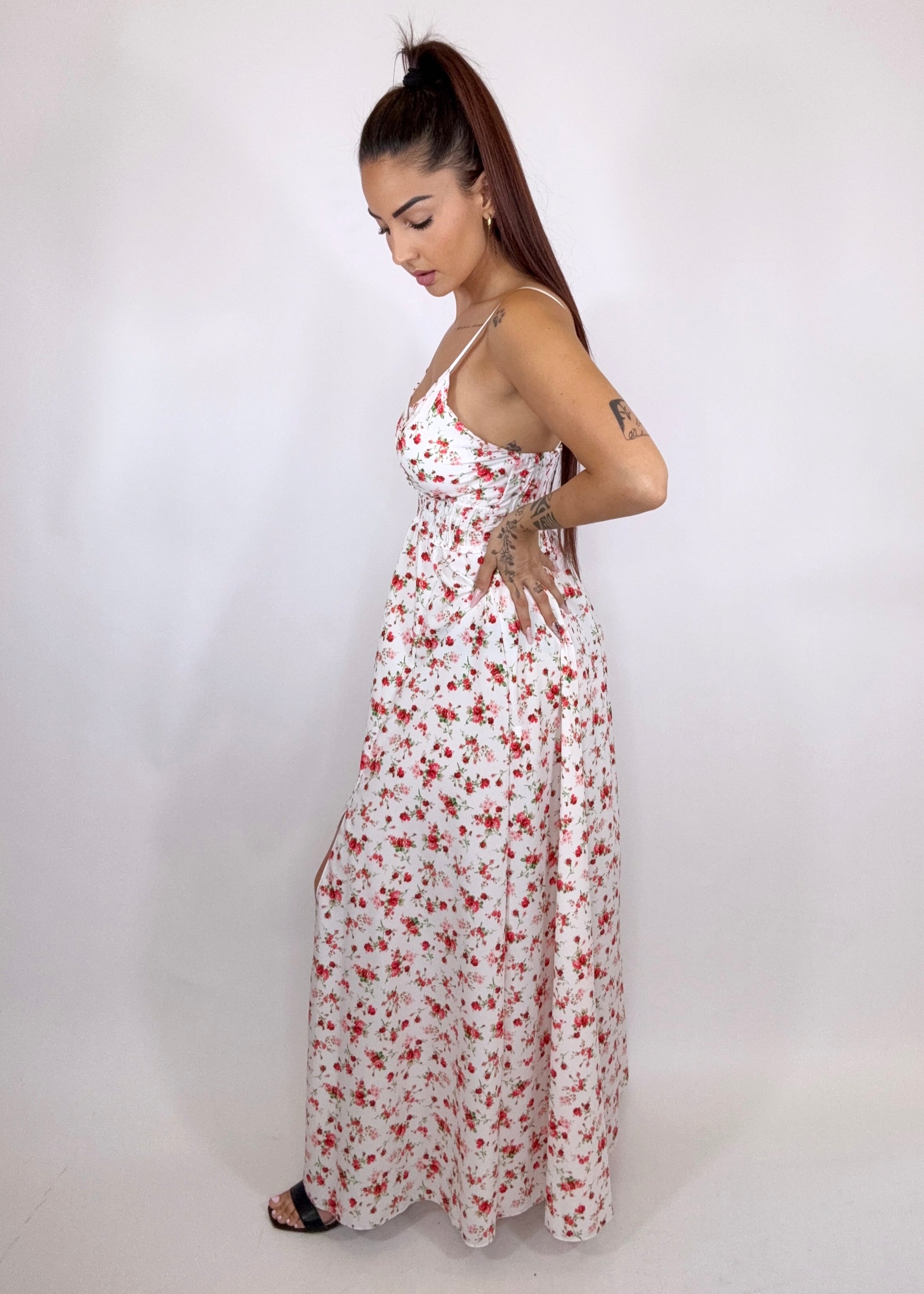 Home/ABITI & TUTE/Abito lungo con fiori rossi - bianco