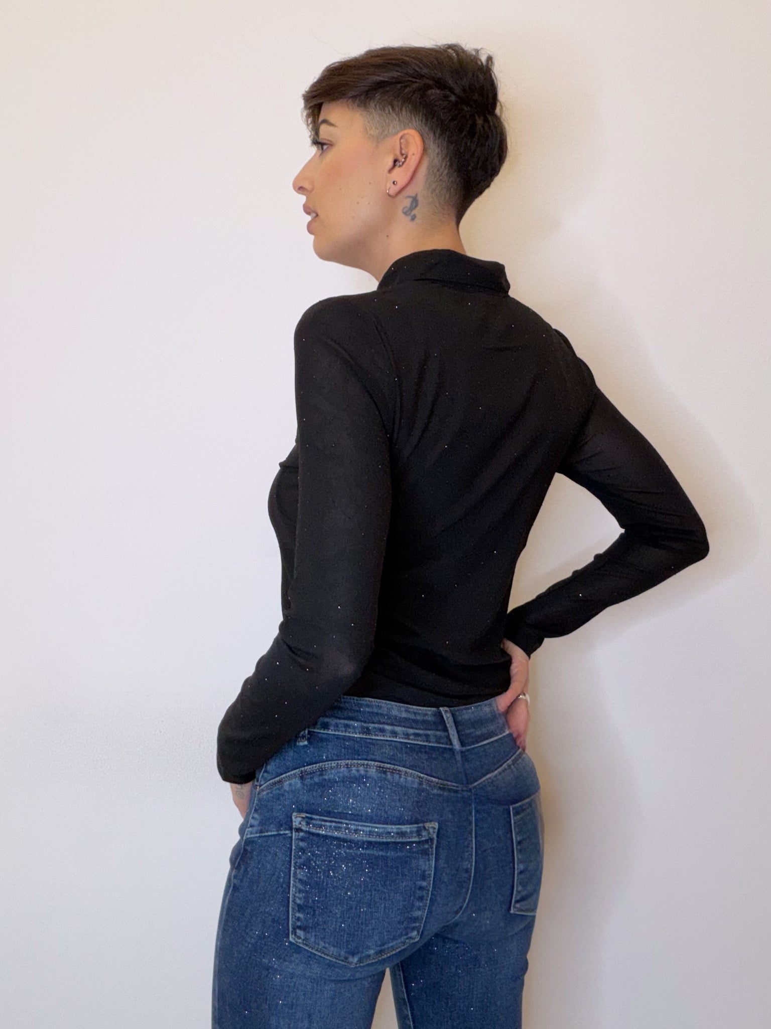 Maglia stile camicia con brillanti, leggermente trasparente ed elasticizzata per una vestibilità comoda.