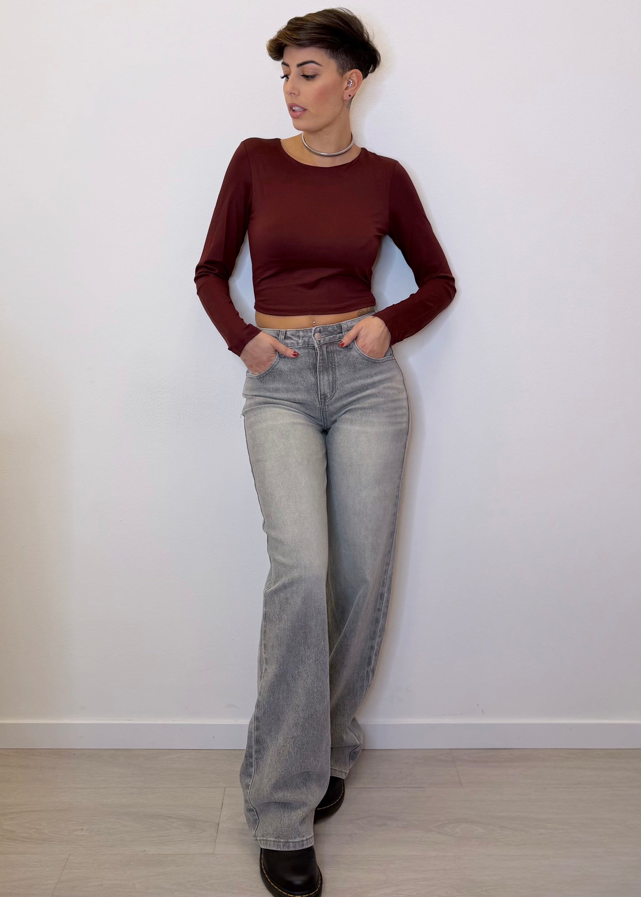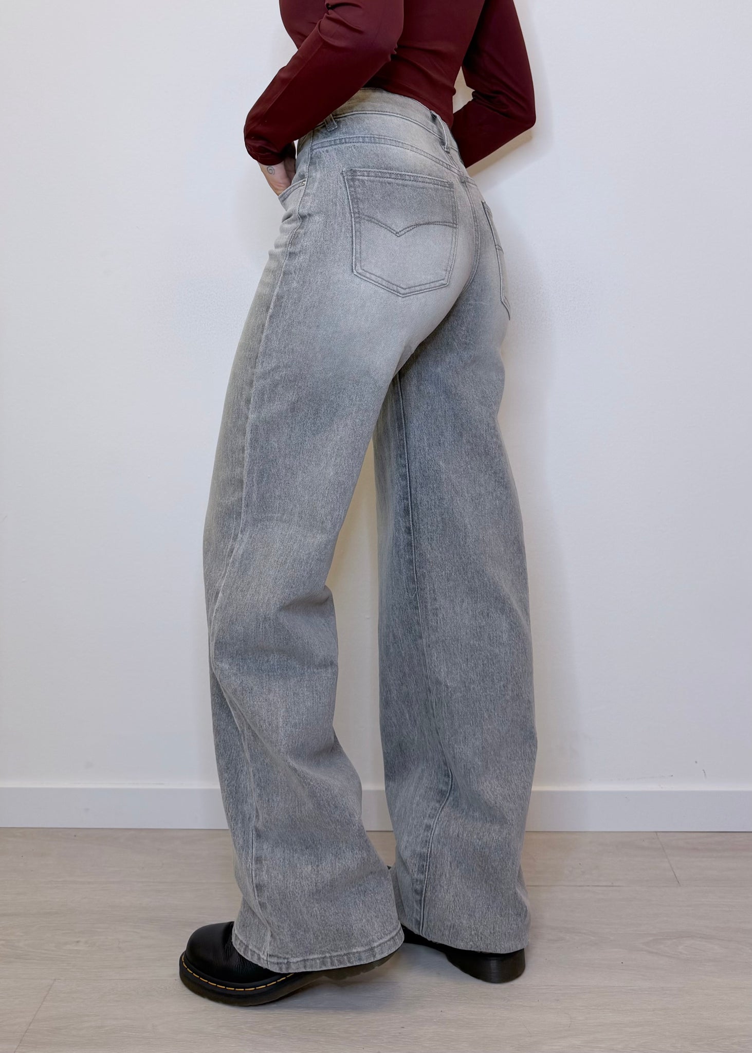 Jeans semi palazzo grigio. La linea fluida valorizza ogni silhouette, mentre la vestibilità comoda lo rende perfetto per ogni occasione, dal giorno alla sera.