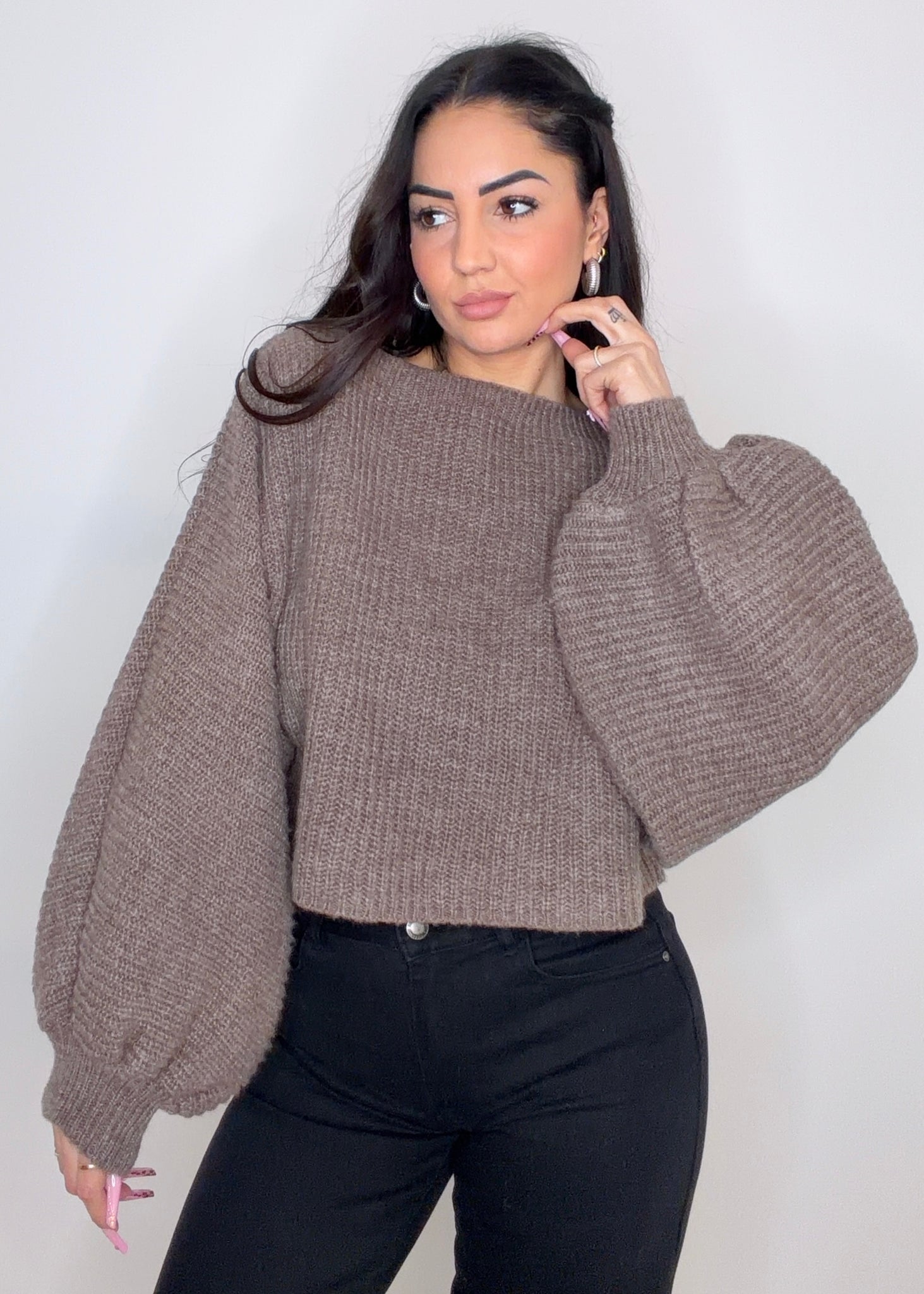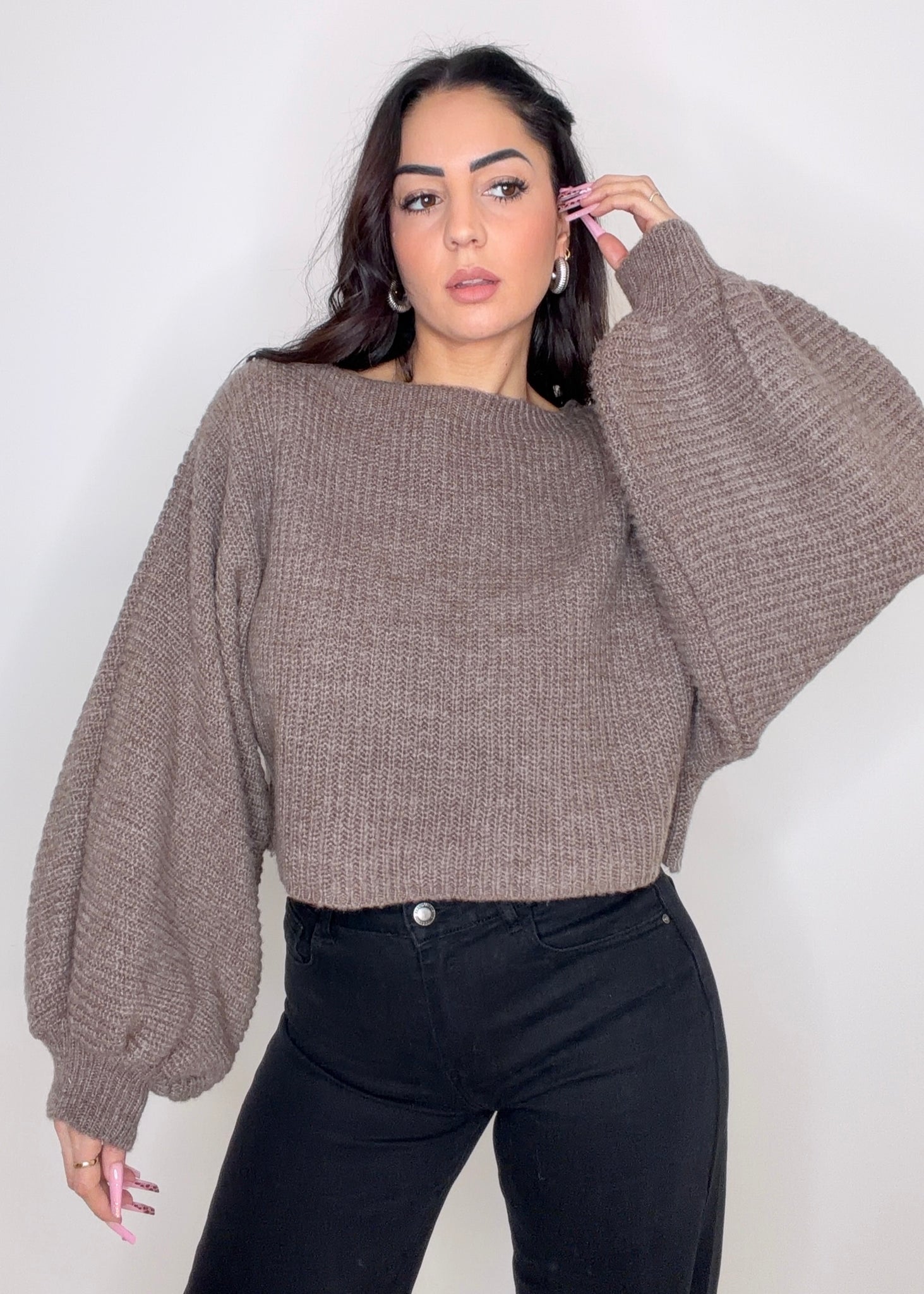 Maglioncino crop dalla manica larga, molto carino e femminile, caratterizzato da una lavorazione a micro treccine. Il tessuto è confortevole, ideale per la stagione.