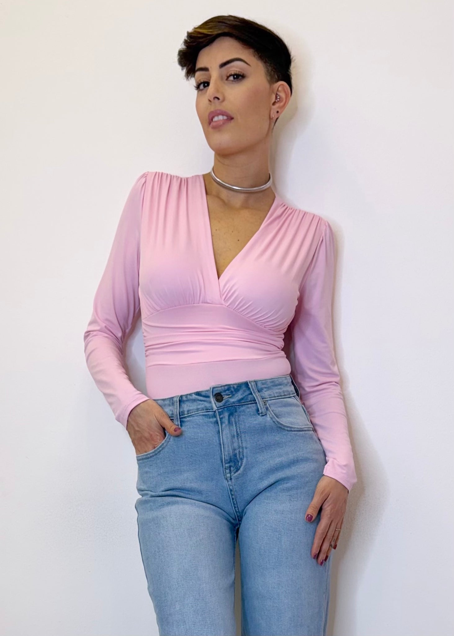 Body con scollo a V e coppe preformate a manica lunga monospalla, taglia unica che veste bene da una XS ad una M.