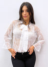 Eleganza audace e femminilità senza tempo si fondono in questa camicia completamente trasparente in pizzo, un capo statement perfetto da indossare da solo o abbinare in layering. Il delicato pizzo floreale disegna la silhouette con leggerezza, mentre il fiocco al collo aggiunge un tocco romantico e sofisticato.