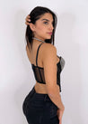 Sensuale e sofisticato, questo top corsetto bustier scolpisce la silhouette con il suo design bicolore e le stecche morbide interne che valorizzano il punto vita. Le coppe preformate offrono supporto, mentre i brillanti scintillanti aggiungono un tocco di lusso. Perfetto per serate glamour, da abbinare a gonne o pantaloni a vita alta per un look irresistibile.