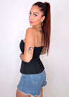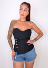Un top dalla linea originale e super femminile, con scollo a barca che valorizza le spalle e coppa preformata per un décolleté definito senza bisogno di reggiseno. Il taglio particolare è impreziosito da bottoncini laterali e da una delicata arricciatura sulla schiena. Vestibilità S/M.