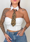 Stiloso e grintoso, questo top corpetto con stecche sotto al seno valorizza le forme con una vestibilità perfetta. Chiusura con zip posteriore e dettagli unici: colletto e cravattino leopardato staccabili per cambiare look in un attimo. Perfetto per outfit audaci e super chic.