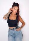 Top basico e versatile in tessuto morbido con coppa preformata all'interno. Perfetto per ogni giorno, da indossare sotto qualsiasi outfit o da solo per un look minimal e comodo. Veste bene da XS ad M.