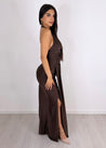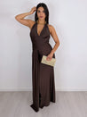 Un capo aderente, raffinato e sensuale, con coppa preformata, schiena scoperta e bottoni dietro al collo. Lo spacco laterale e lo strascico collaterale donano movimento e femminilità.