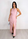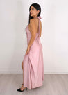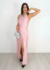 Raffinato e femminile, questo abito è perfetto per cerimonie ed eventi speciali. Il girocollo con laccio da annodare dietro lascia intravedere la parte alta della schiena, regalando un tocco sensuale ma sempre elegante. Il dettaglio drappeggiato sul fianco scolpisce delicatamente la silhouette, mentre lo spacco sulla gamba sinistra aggiunge movimento e leggerezza.