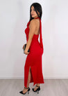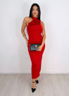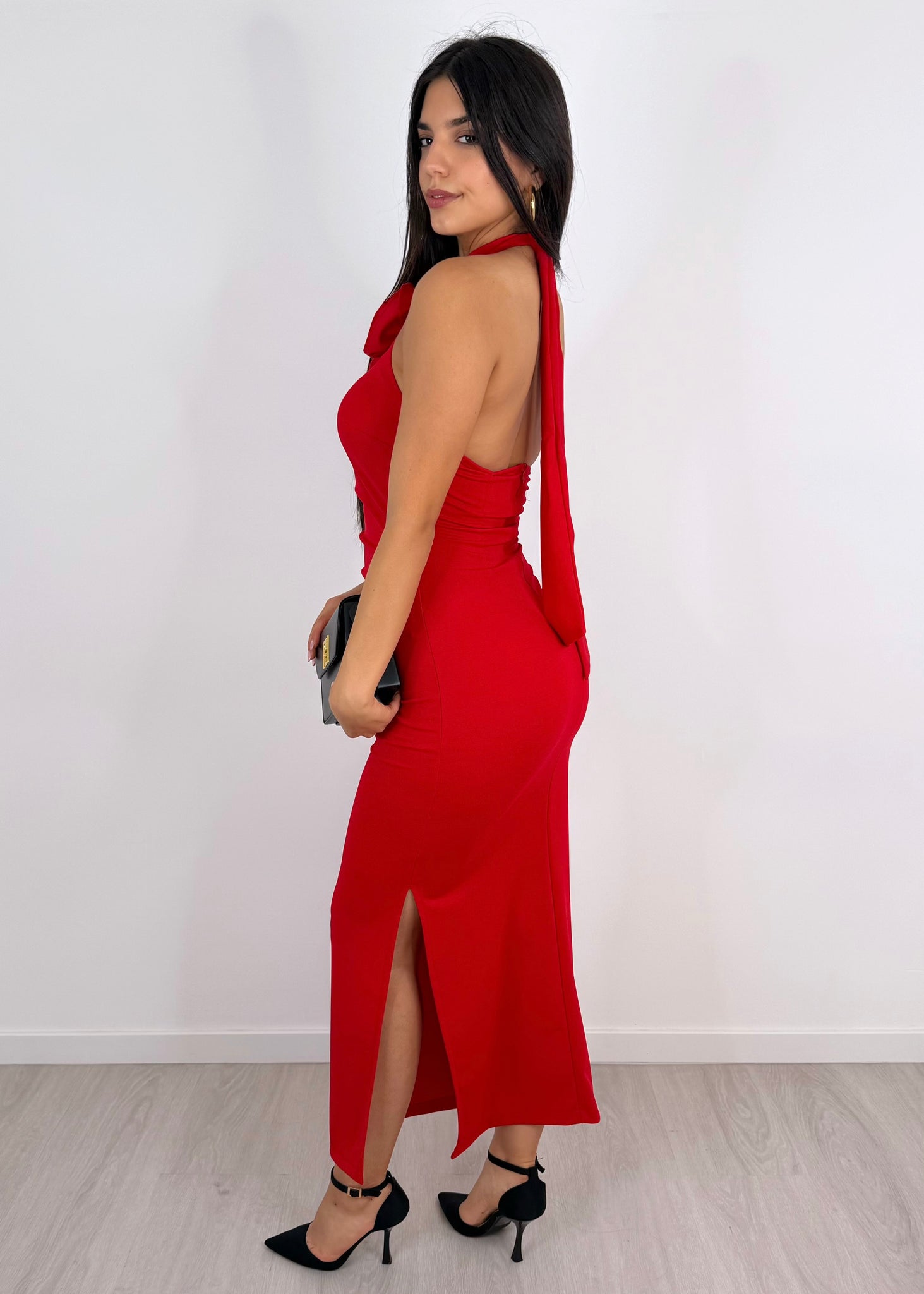 Un abito raffinato, perfetto anche per cerimonie ed eventi speciali. Sul décolleté spiccano tre rose applicate che donano un tocco romantico, valorizzate da un mezzo collo con fiocco sul retro. La schiena seminuda aggiunge sensualità con discrezione, mentre lo spacco laterale slancia la figura.