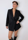 Blazer nero dallo stile oversize, perfetto per un look moderno e super glam. Presenta un doppio bottone, finte tasche e un finish interamente ricoperto di brillantini che dona luminosità e carattere ad ogni outfit.
