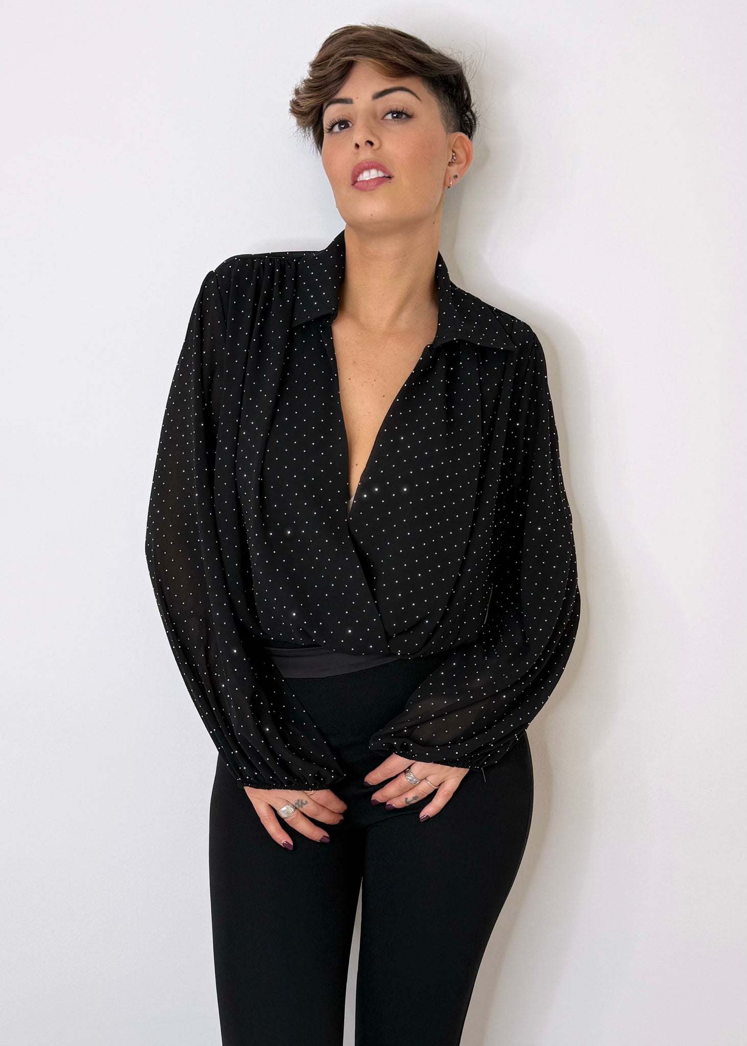 Body stile camicia con scollo a V e colletto elegante e luminoso, realizzato in tessuto completamente brillantato che dona un tocco glamour a ogni outfit. Lo scollo a V valorizza la silhouette, mentre il colletto aggiunge un dettaglio chic.