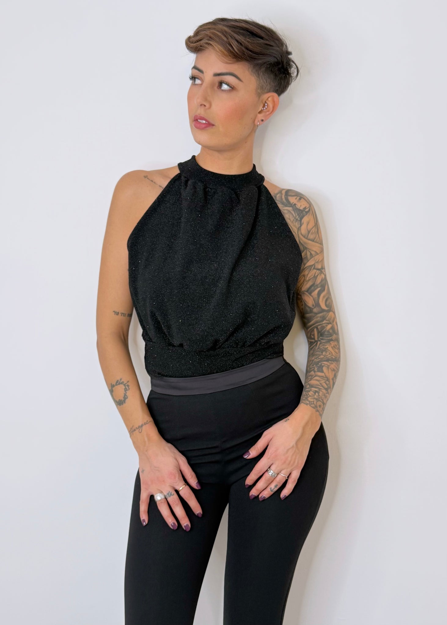 Body smanicato dal fascino luminoso, realizzato con tessuto brillantinato che cattura la luce a ogni movimento. L’effetto sparkling lo rende perfetto per look da serata o per un outfit stile Capodanno.