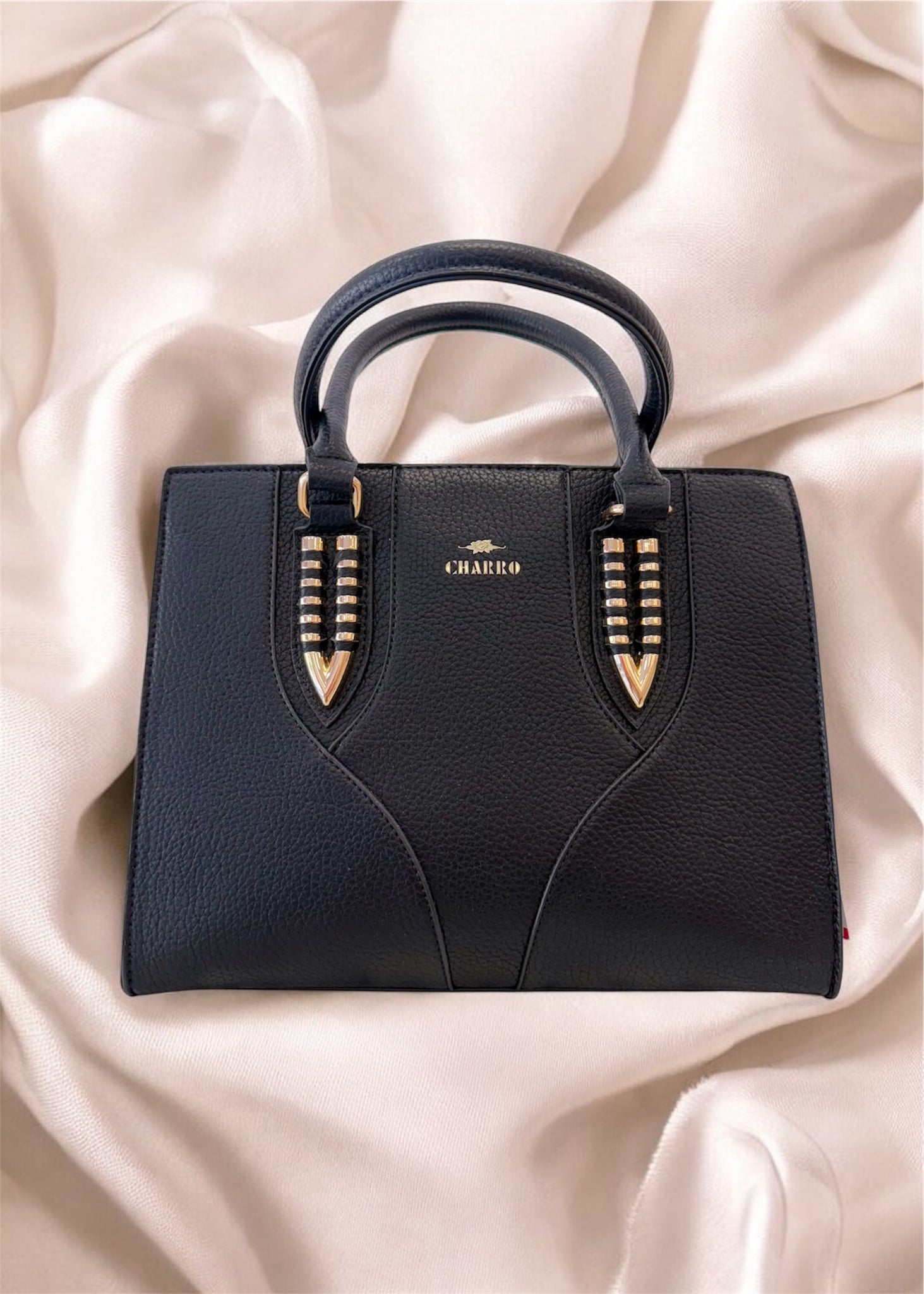 Borsa di dimensione media in ecopelle nera, con cuciture curvate e raffinate rifiniture stile proiettile che le donano carattere e originalità. Elegante e decisa, è il dettaglio perfetto per completare look contemporanei con stile.
