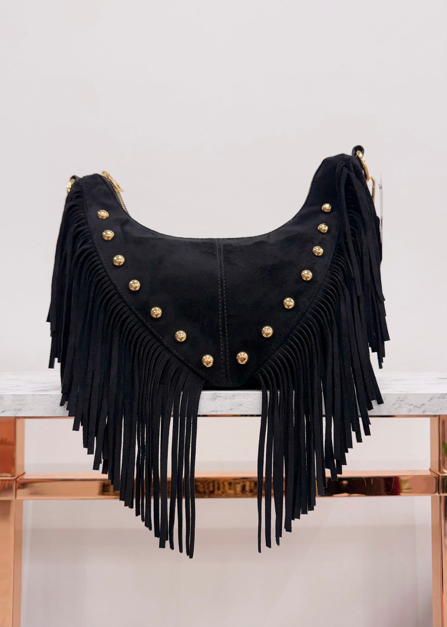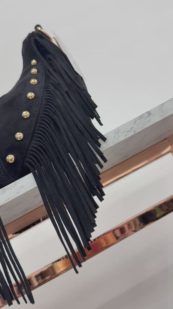 Questa borsa mezzaluna media in vera pelle si distingue per il suo design accattivante e i dettagli ricercati. Le frange laterali donano movimento e personalità, mentre le borchie dorate sul davanti aggiungono un tocco grintoso e glamour.