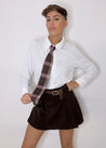 Camicetta morbida, leggermente corta ma non troppo con cravatta in tessuto inclusa.