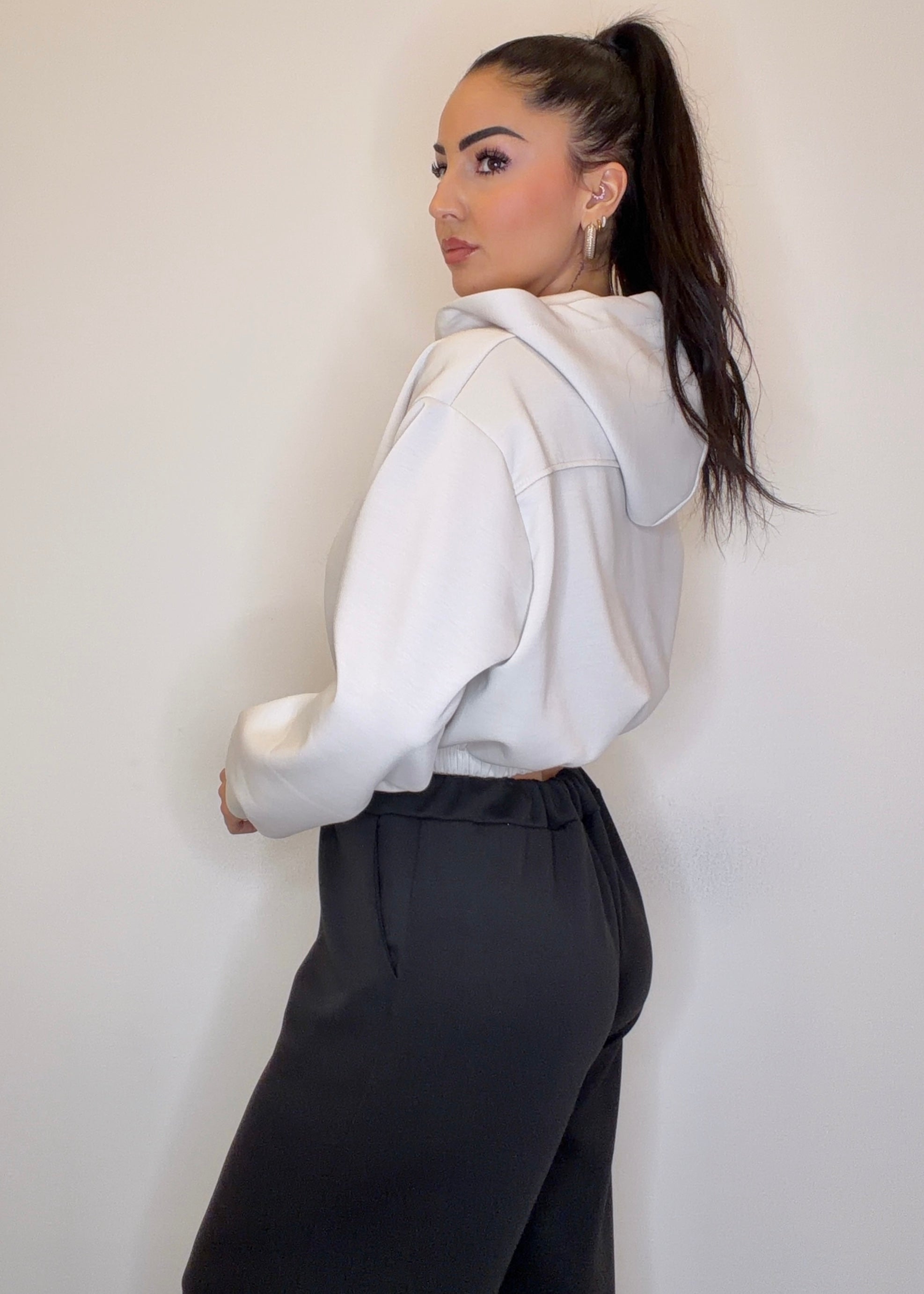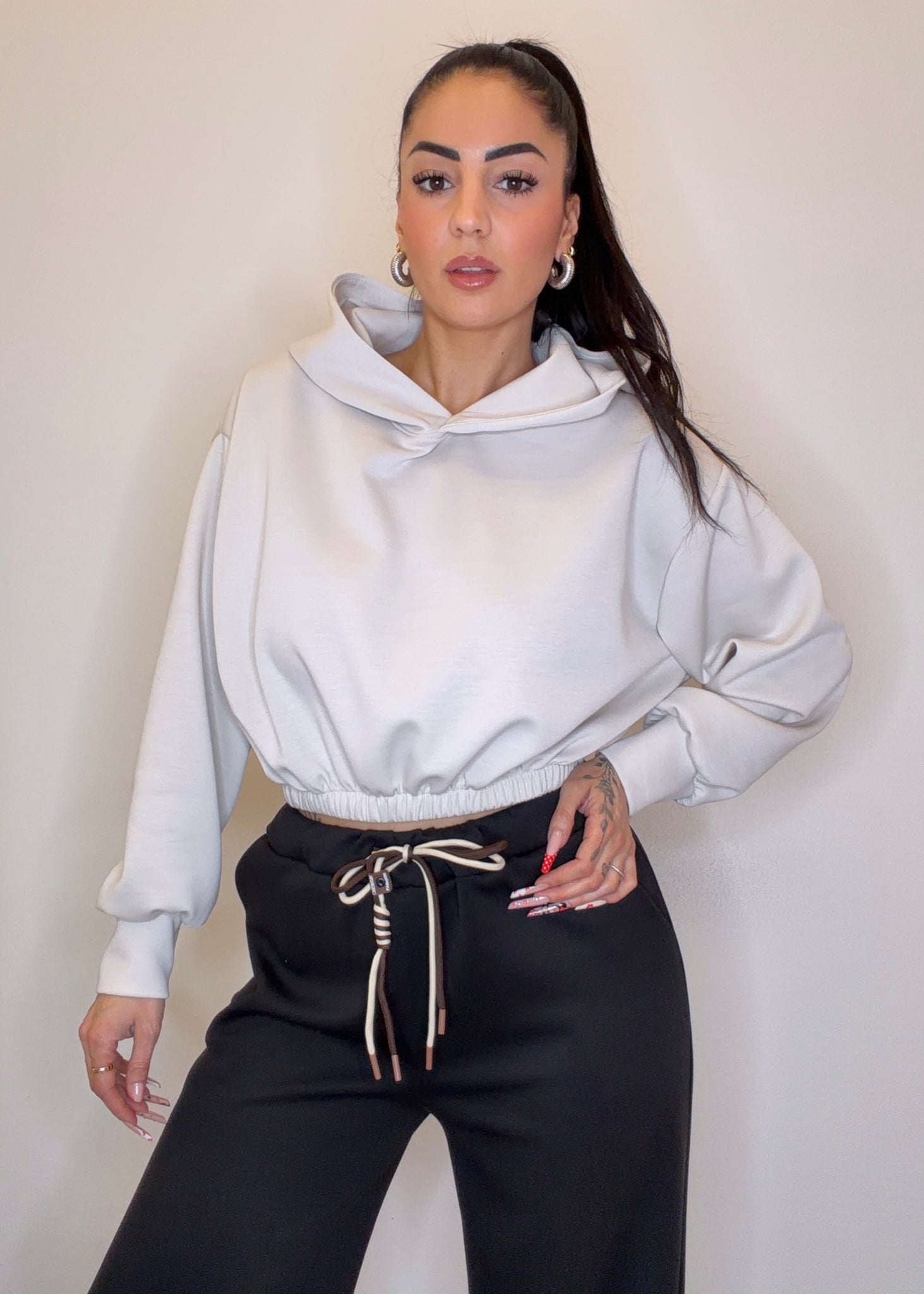Felpa basic con cappuccio, realizzata in un tessuto di qualità, particolarmente morbido e piacevole al tatto. Il modello presenta una vestibilità leggermente cropped, valorizzata da una delicata arricciatura in vita che definisce la silhouette senza rinunciare al comfort.