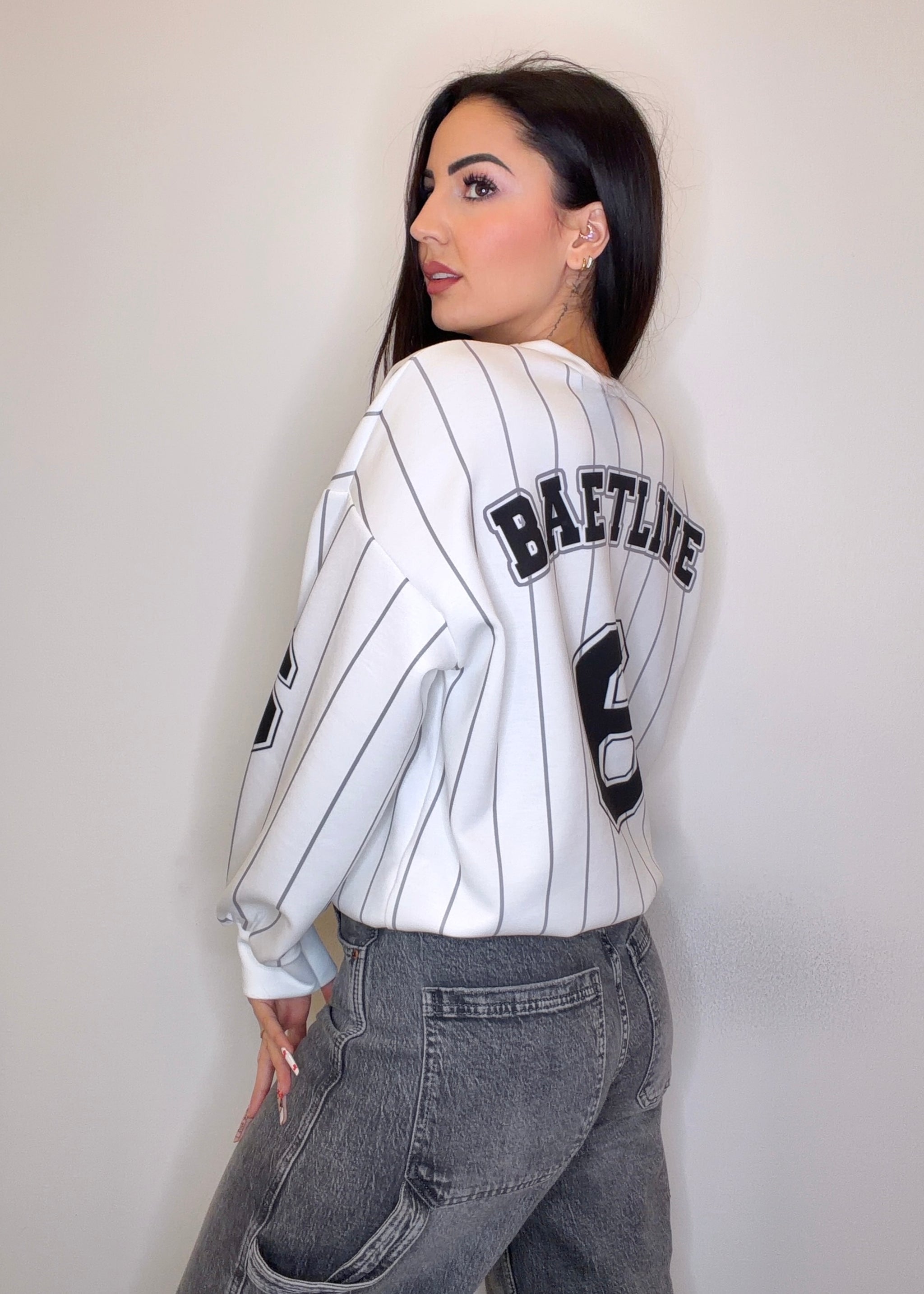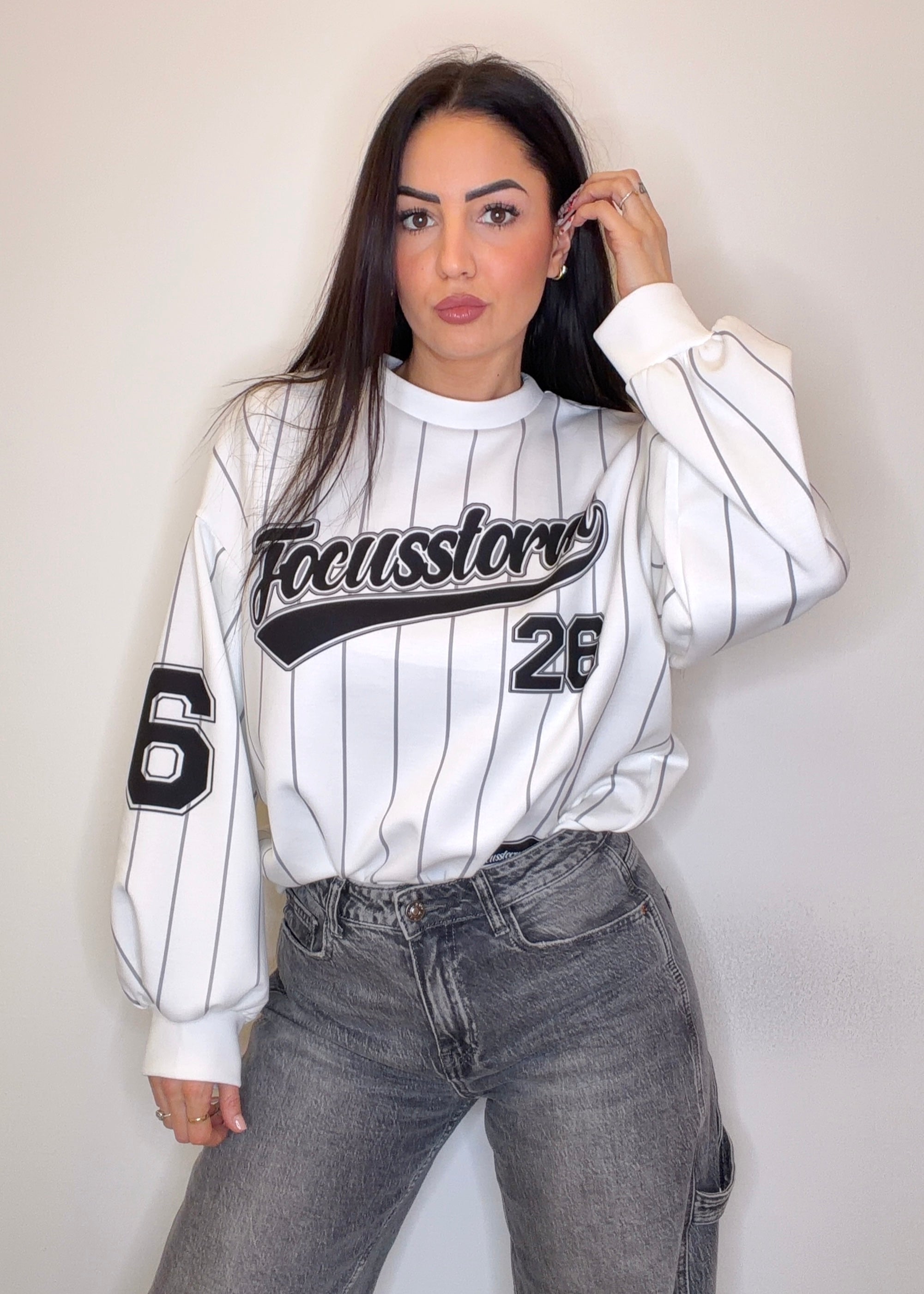 Felpa girocollo a righe in stile basket, ispirata alle divise NBA come quelle dei Los Angeles Lakers e dei Chicago Bulls.