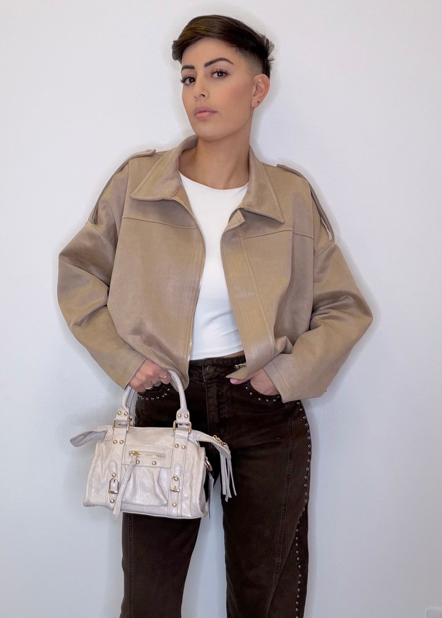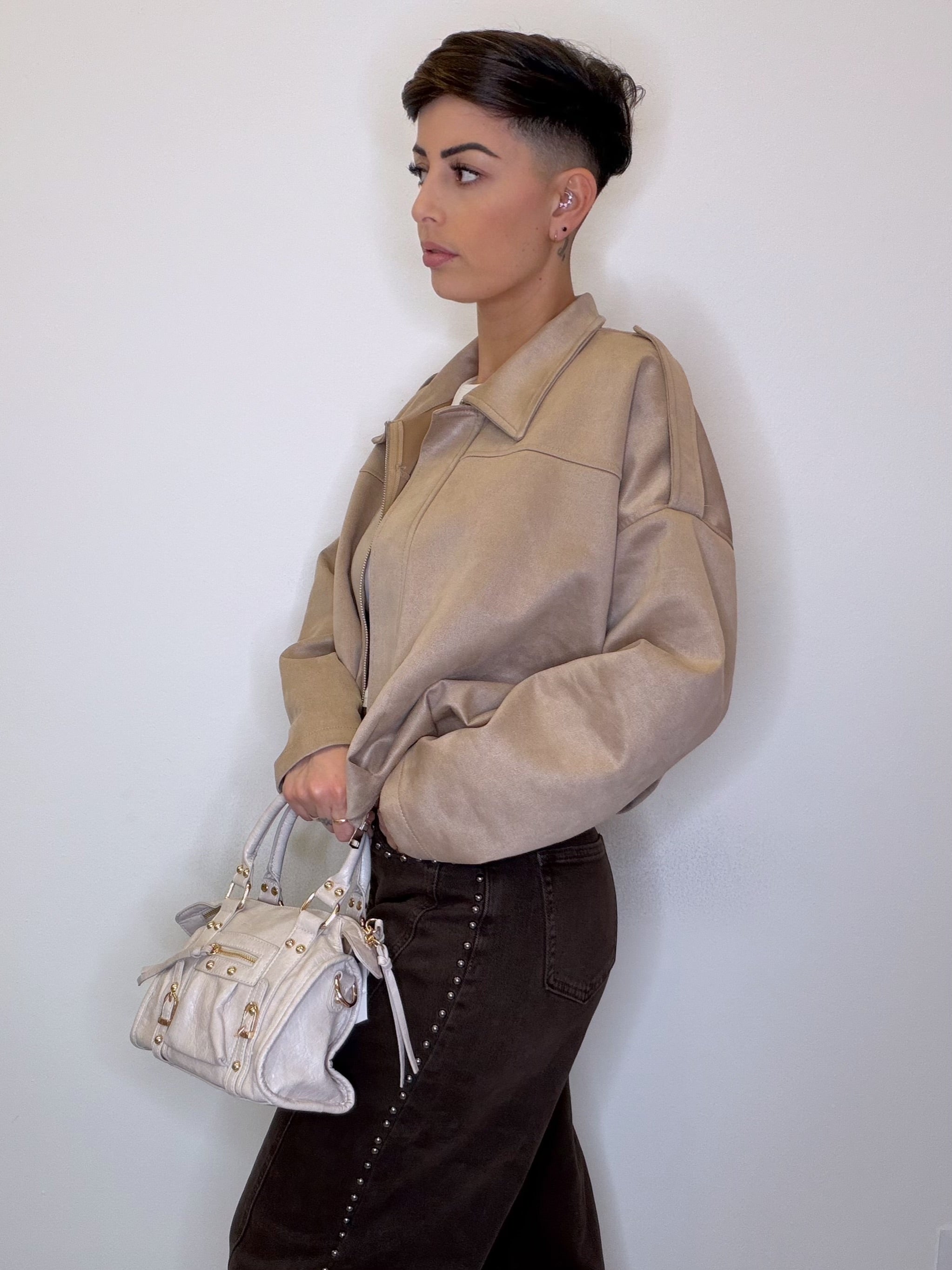Bomber dal volume morbido e avvolgente, con effetto palloncino super cool. Il taglio over è studiato per cadere bene su tutte le fisicità, vestendo comodamente dalla XS alla XL senza perdere forma o stile. Linea ampia ma armoniosa, spalle morbide e vestibilità rilassata che dona subito carattere al look.