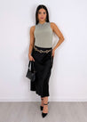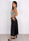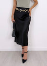 Gonna lunga in tessuto effetto raso, semplice e raffinata, con elastico sottile in vita che garantisce comfort e una vestibilità versatile. Il taglio scivolato valorizza la figura con eleganza, adattandosi perfettamente da una taglia XS fino a una M abbondante.