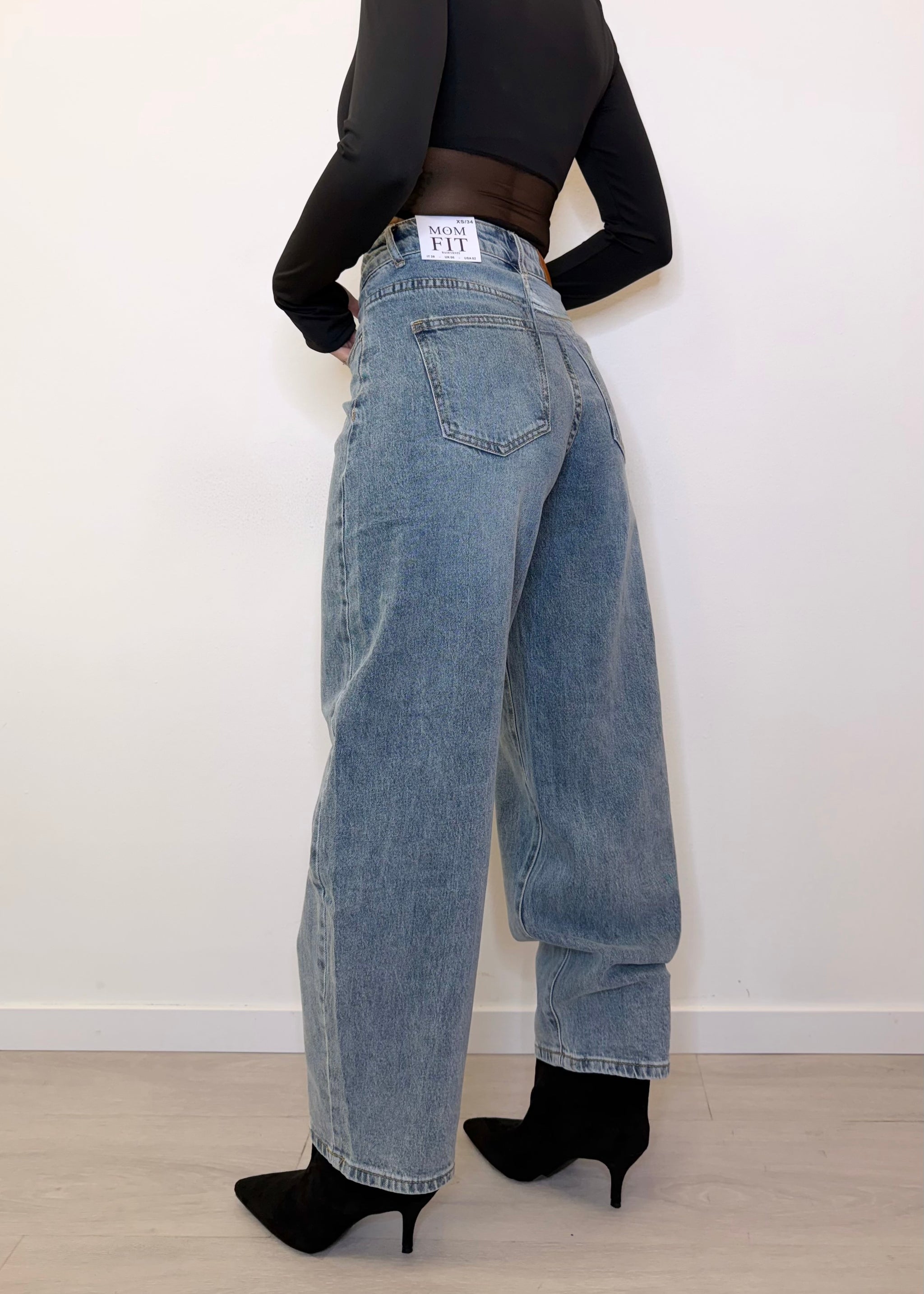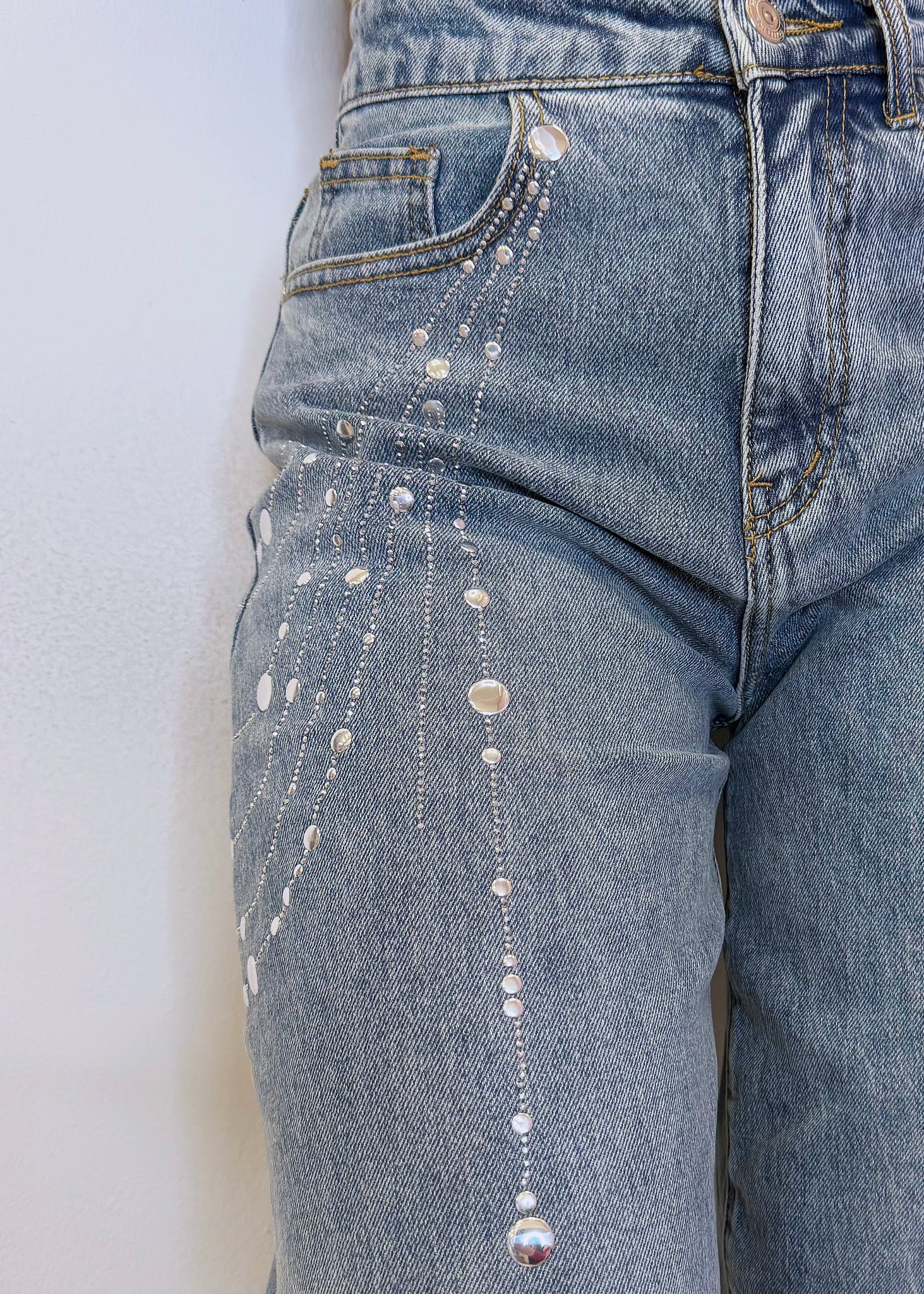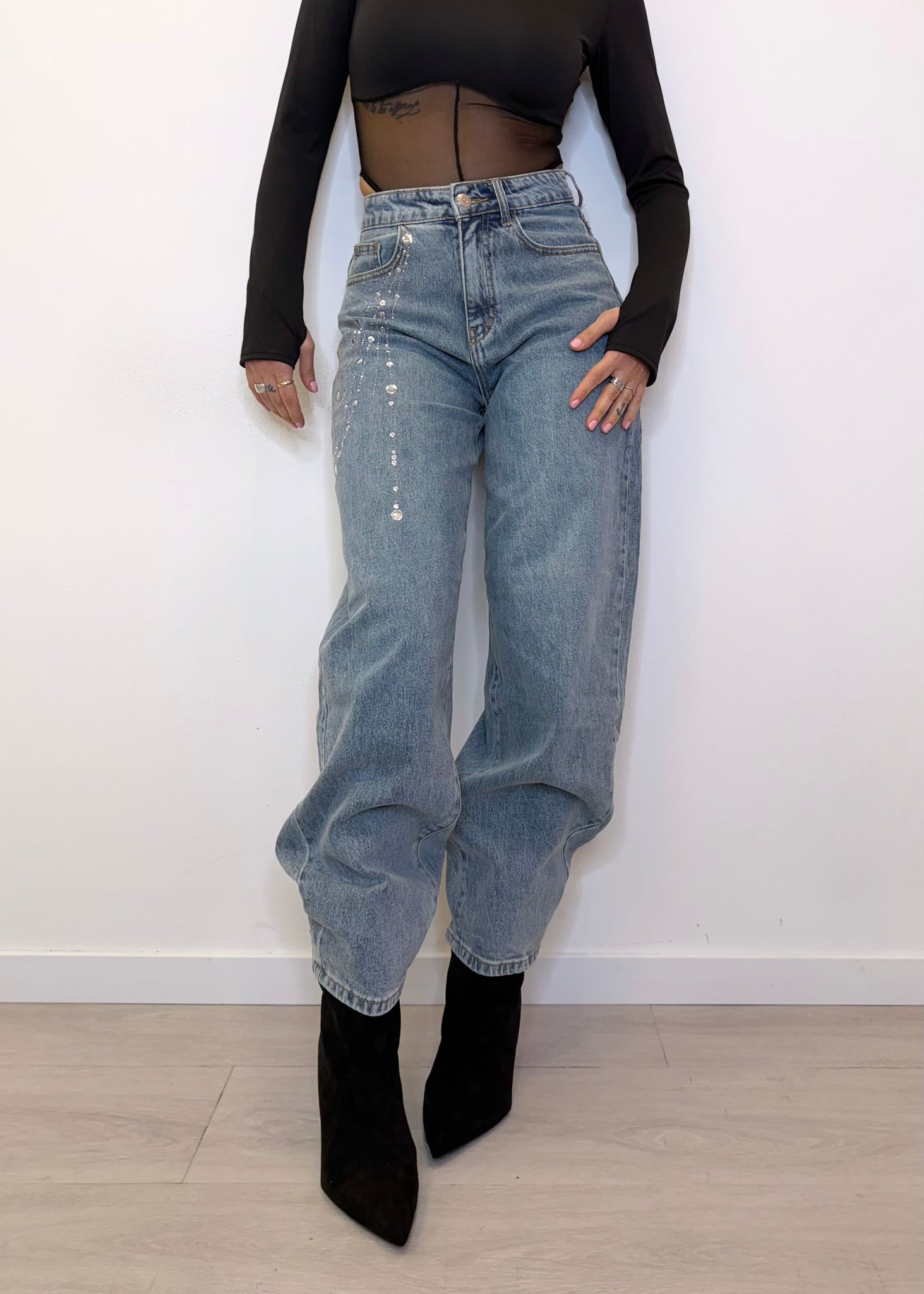Balloon jeans stile vintage con brillantini e cinturino sempre in jeans. Disponibile dalla XS alla L. Stile ampio e comodo, con un tocco scintillante per un look casual ma originale.