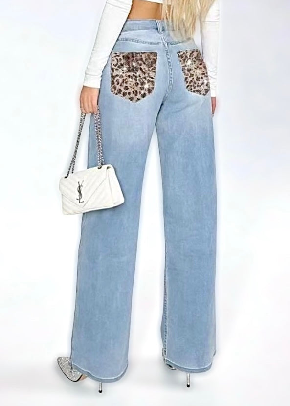 Jeans modello palazzo dal fit elegante e super femminile, con gamba ampia che slancia la silhouette e dona un’allure sofisticata. Il vero punto forte è il retro: tasche leopardate impreziosite da brillanti che catturano la luce e rendono il capo unico e irresistibile.