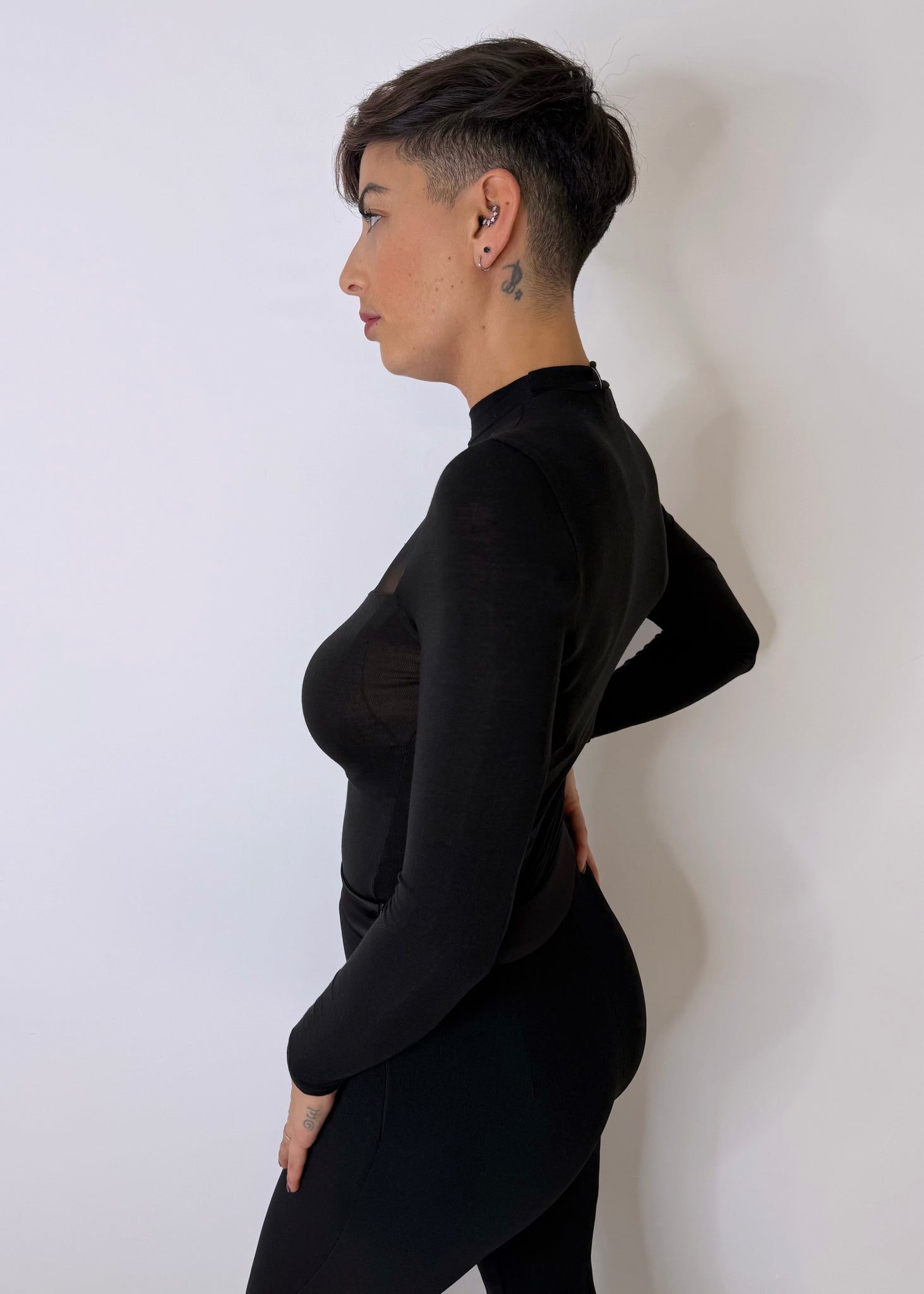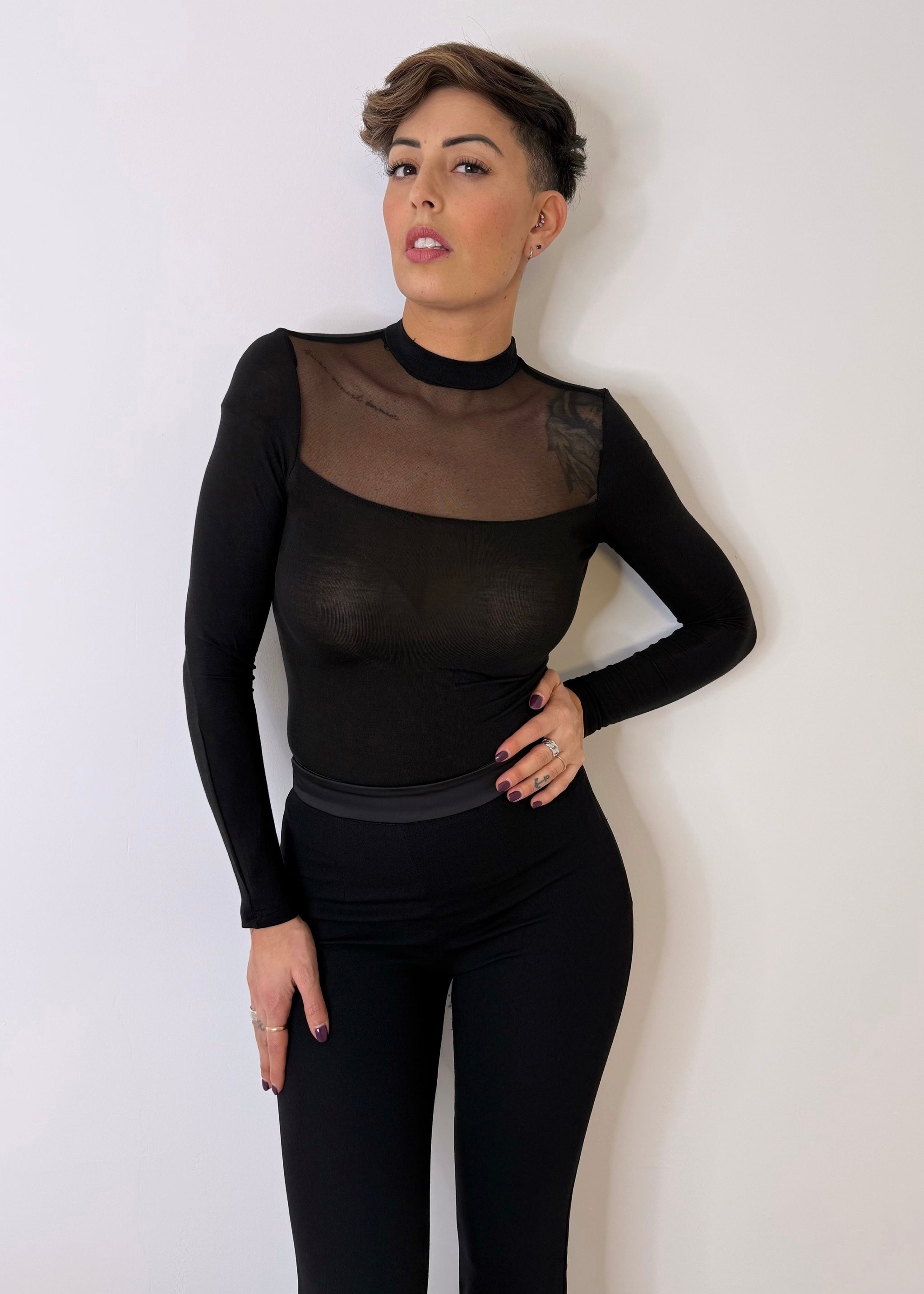 Maglia elasticizzata con dettaglio trasparente nella parte superiore e mezzo collo semplice, che conferisce un’eleganza discreta. Realizzata in taglia unica, veste comodamente fino a una L. Un capo sofisticato e versatile, perfetto per look raffinati senza rinunciare al comfort.