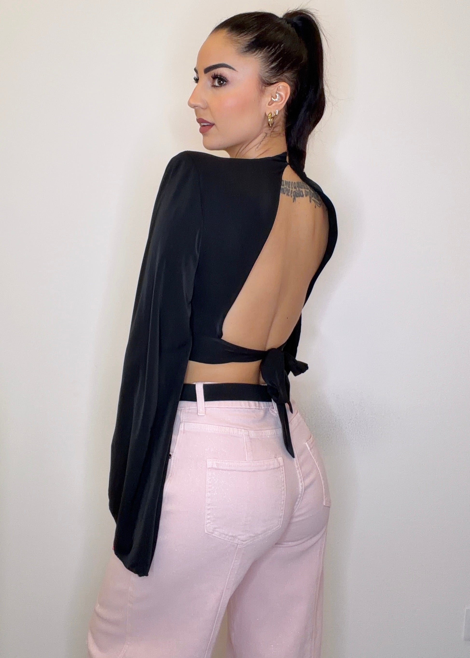Maglia in simil raso con spalline imbottite e maniche molto ampie. Modello femminile con apertura a goccia sul seno e schiena nuda, elegante e d’impatto.