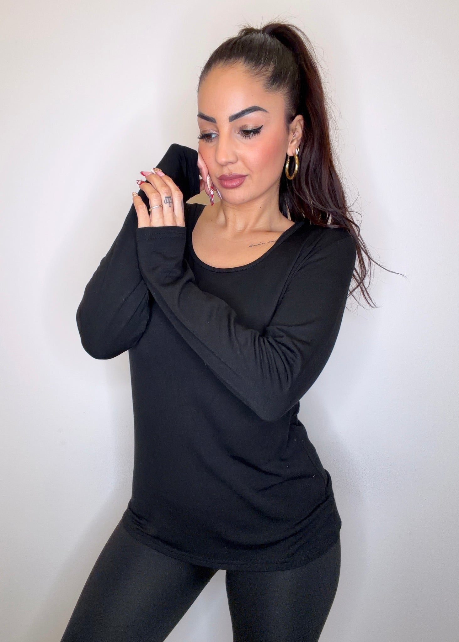 Maglia basica felpata lunga oversize giro collo, elasticizzata e molto morbida, che veste una taglia over che può andar bene da una M ad una XL.