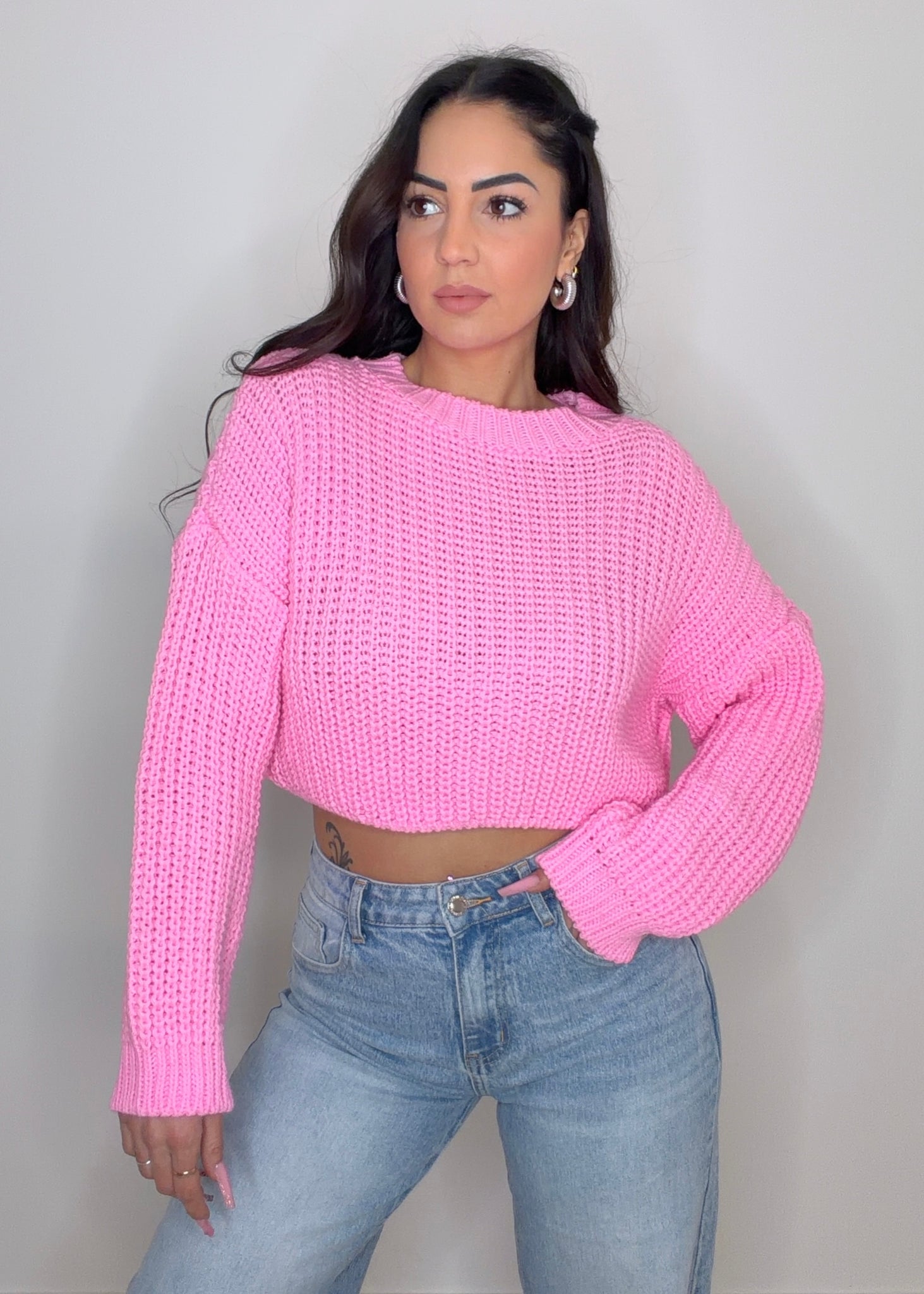 Maglioncino crop in acrilico, dal design molto carino e femminile, caratterizzato da una lavorazione a micro treccine. Il tessuto è confortevole, ideale per la stagione.
