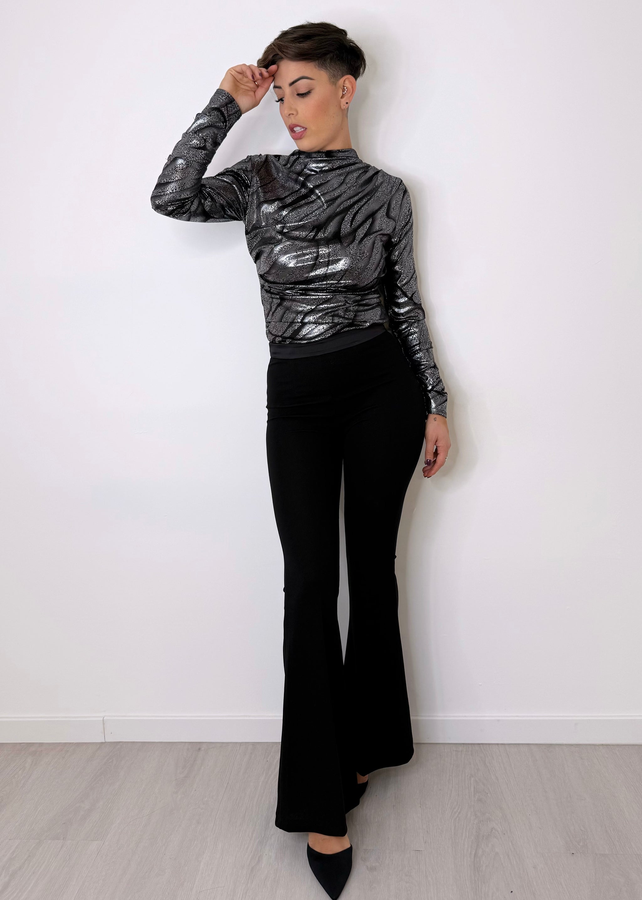 Pantalone a zampa molto femminile e chic, perfetto per valorizzare le curve. Realizzato in tessuto morbido ma strutturato, veste perfettamente dalla taglia S alla L, adattandosi alle diverse silhouette. La cerniera laterale garantisce una chiusura comoda e discreta, mentre la linea a zampa allunga la figura e dona un tocco rétro moderno. Ideale per look casual o più eleganti, da abbinare a tacchi o sneakers a seconda dell’occasione.