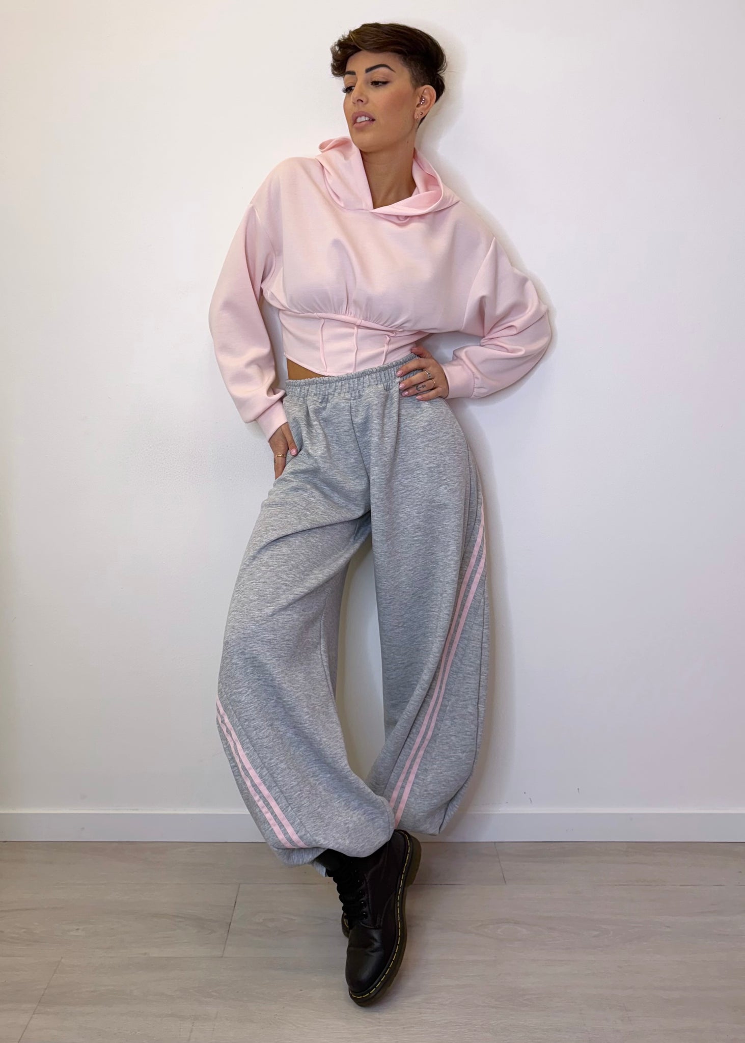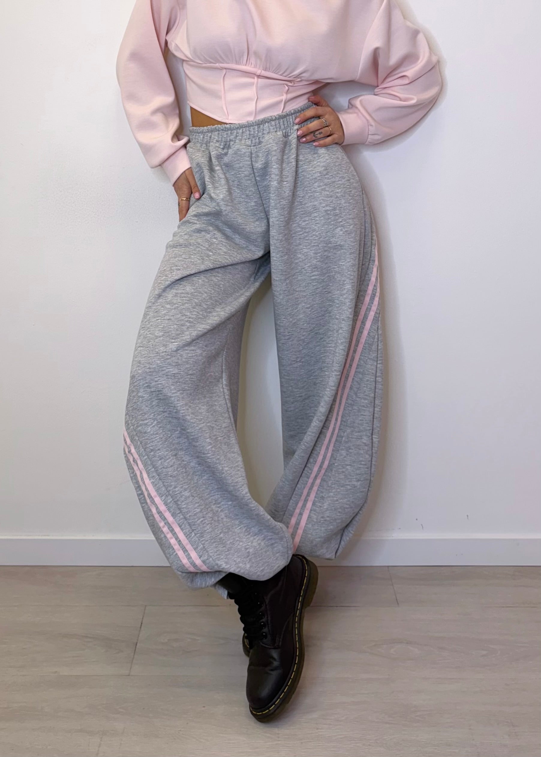 Reso ancora più particolare dalle 2 righe laterali rosa chiaro che donano un tocco sportivo e glamour. Il fondo può essere indossato a palazzo per un effetto fluido oppure stretto con i ganci per un mood più street.
