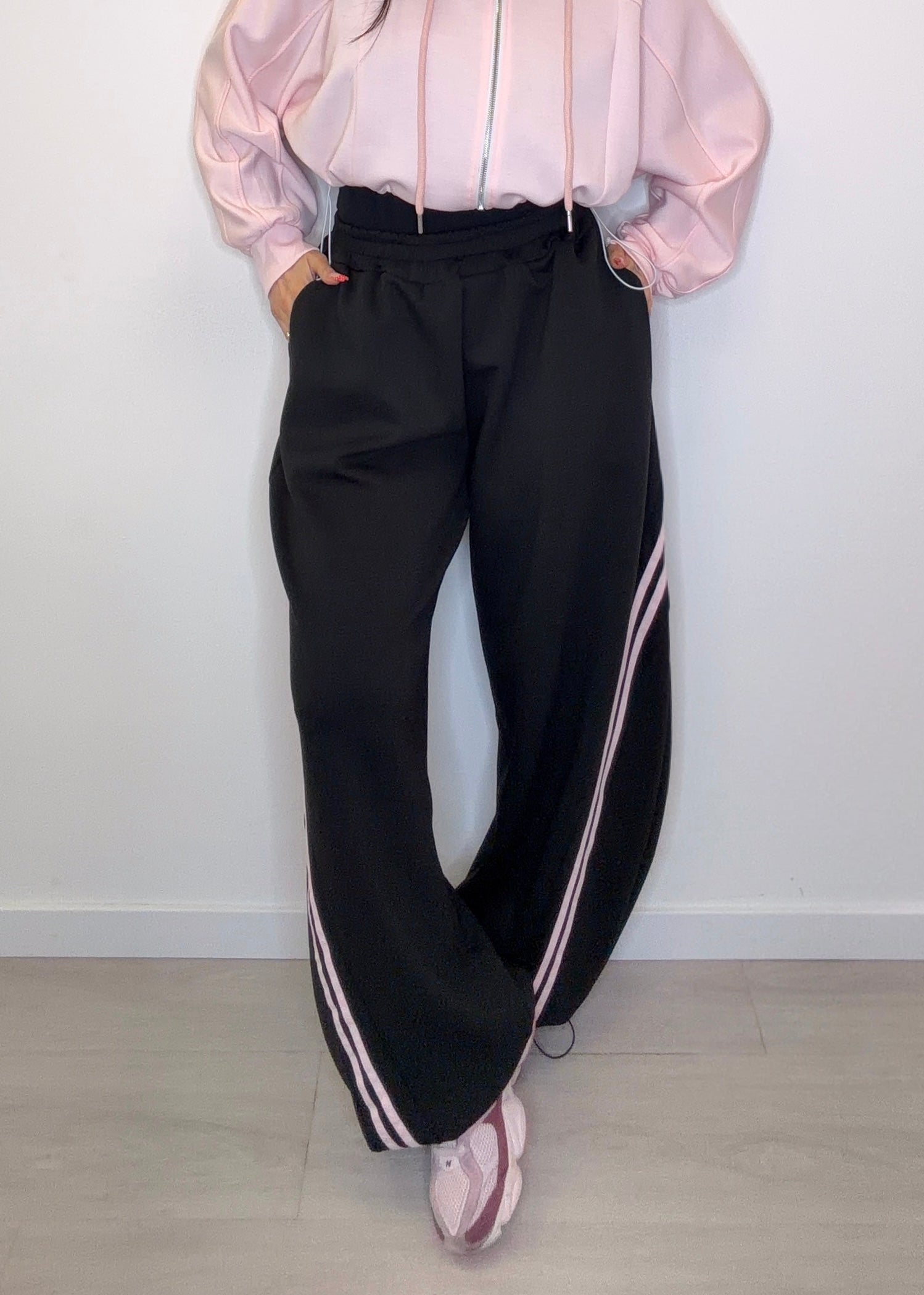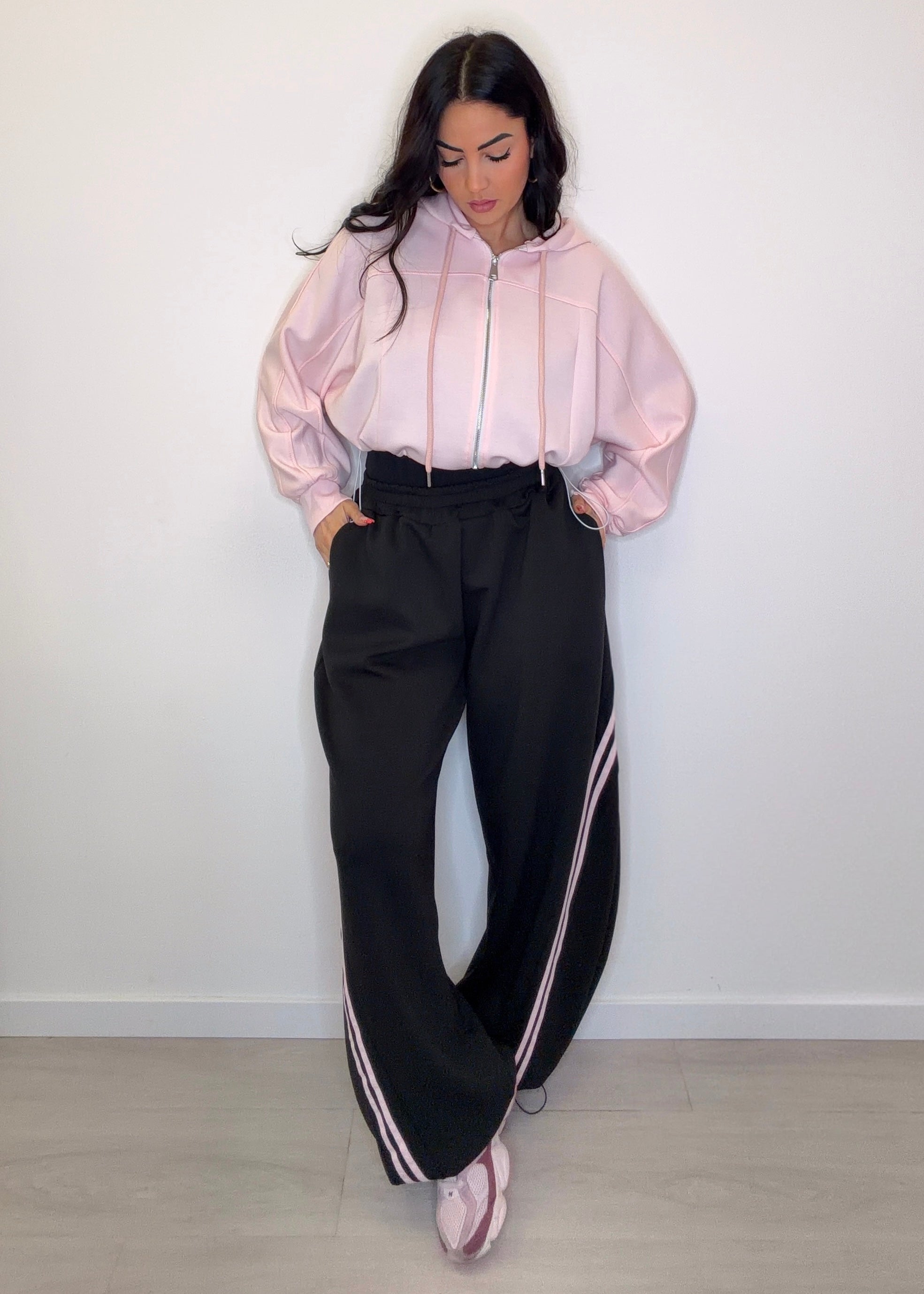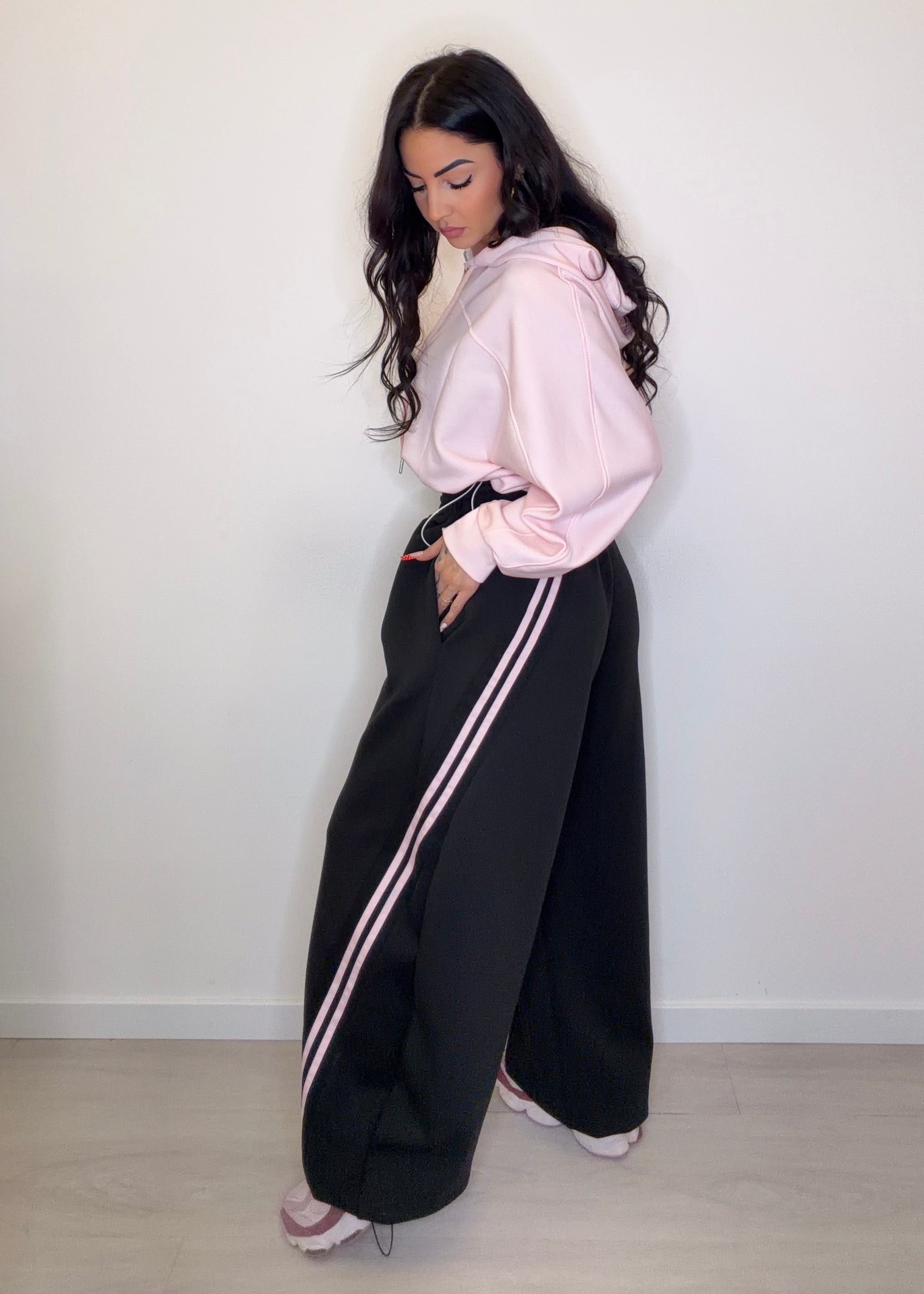 Reso ancora più particolare dalle 2 righe laterali rosa chiaro che donano un tocco sportivo e glamour. Il fondo può essere indossato a palazzo per un effetto fluido oppure stretto con i ganci per un mood più street.
