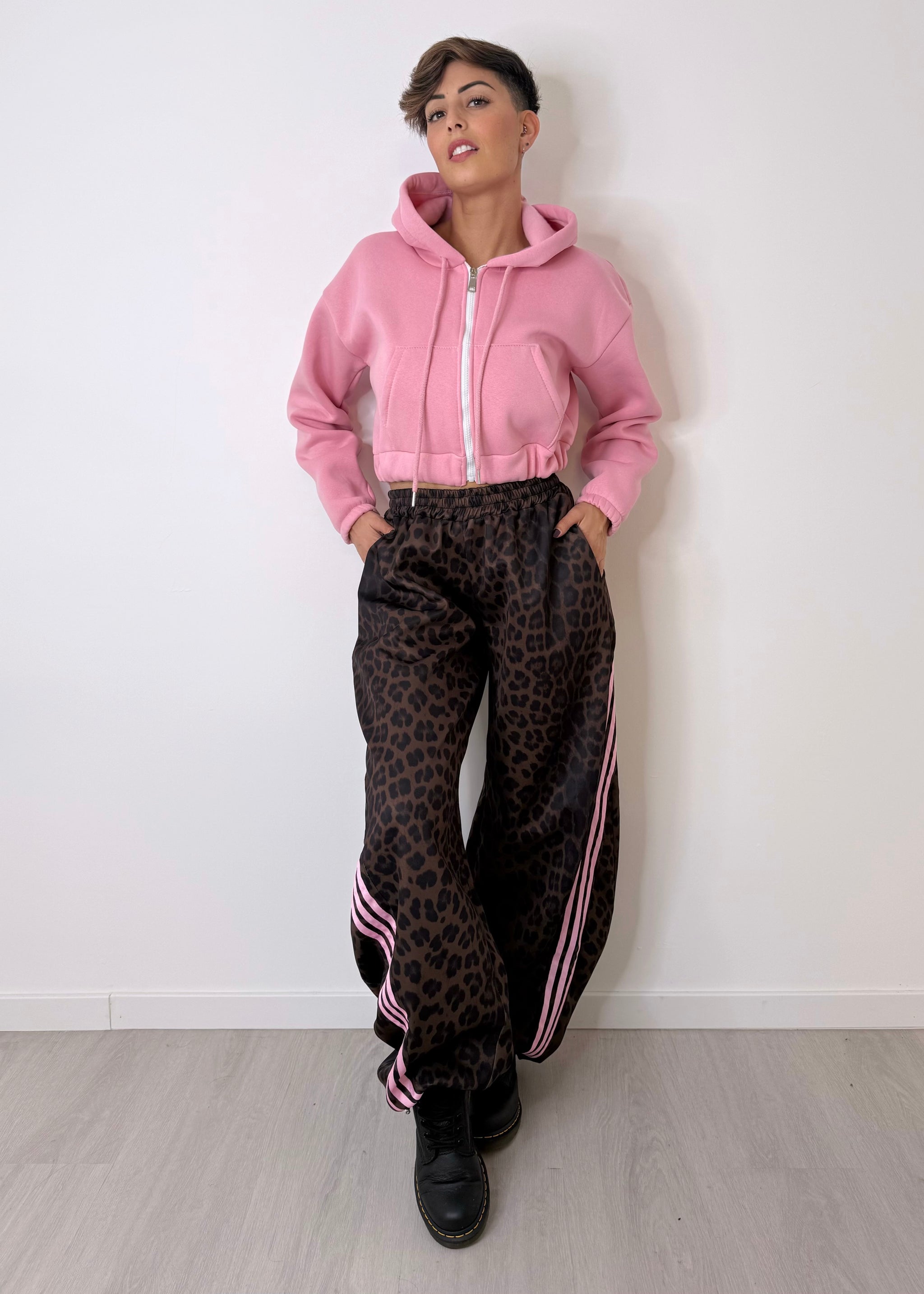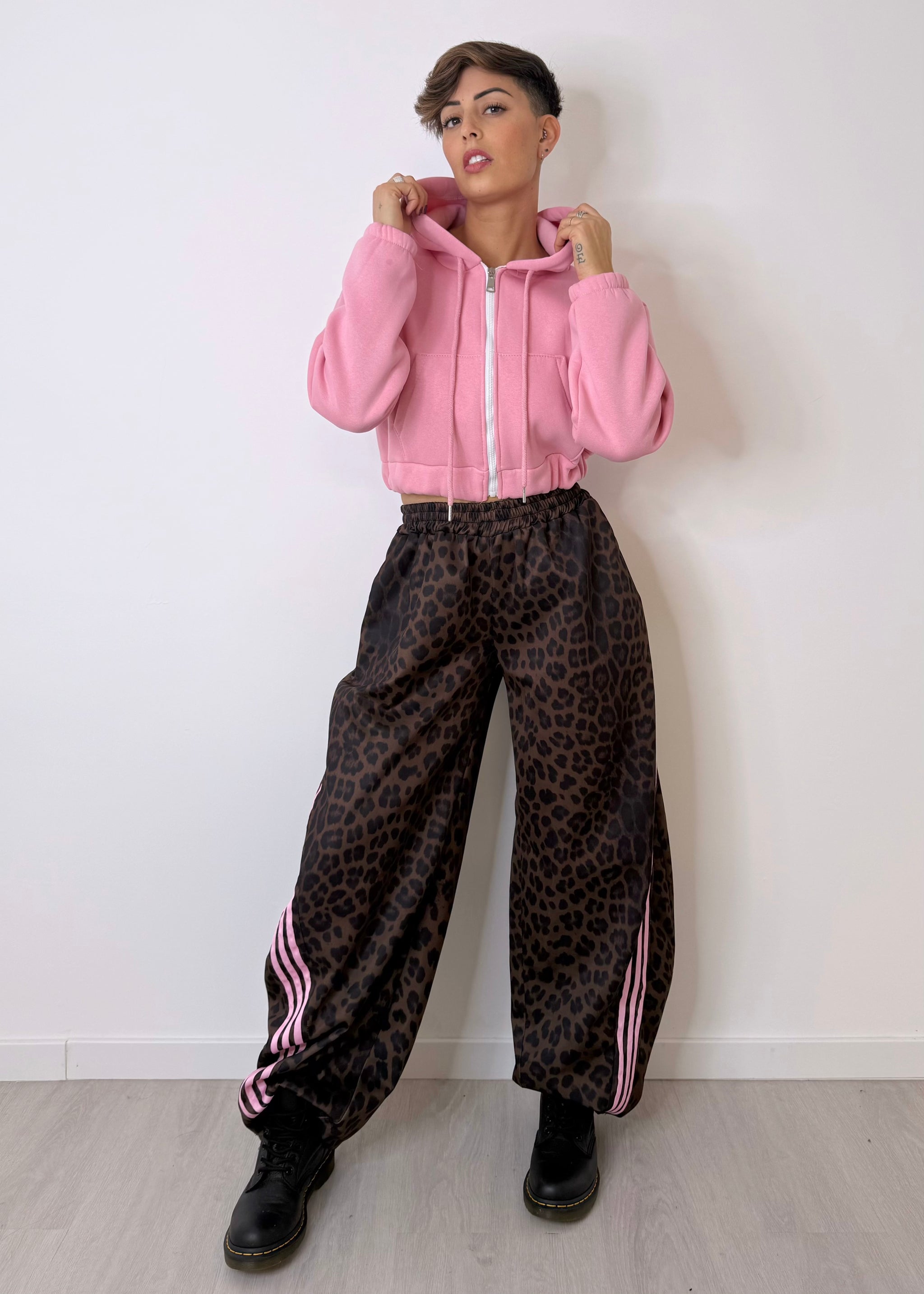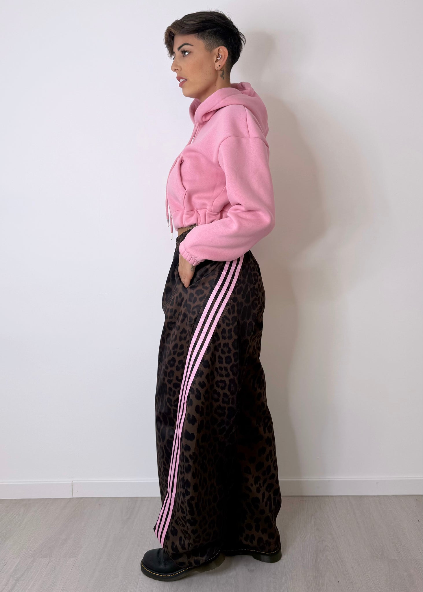 Interamente leopardato, è reso ancora più particolare dalle tre righe laterali rosa che donano un tocco sportivo e glamour. Il fondo può essere indossato a palazzo per un effetto fluido oppure stretto con i ganci per un mood più street.