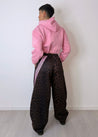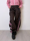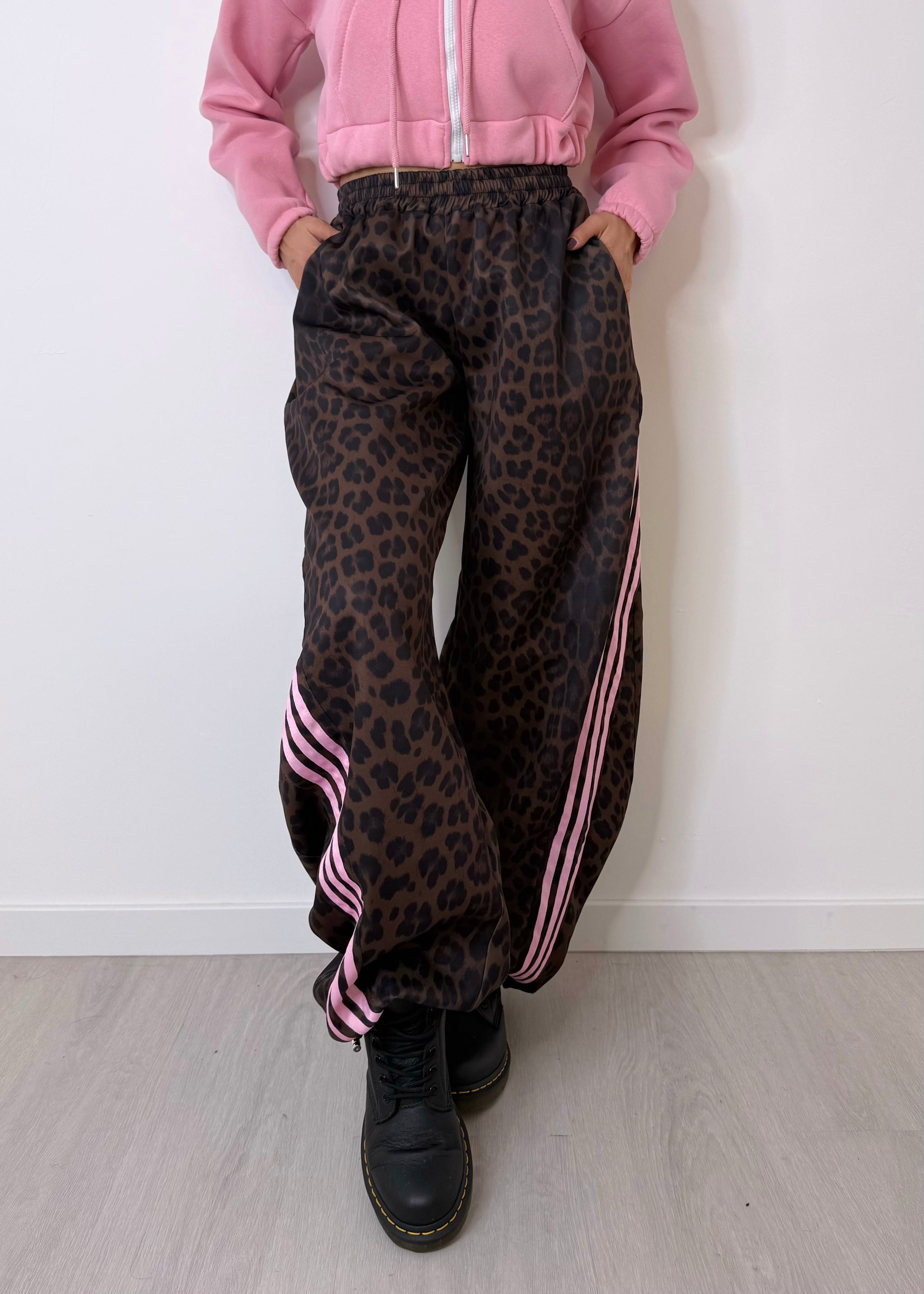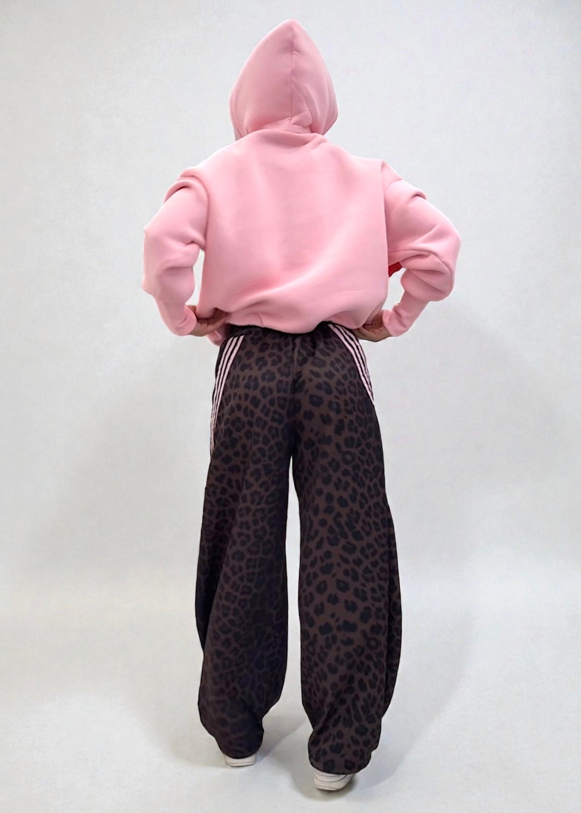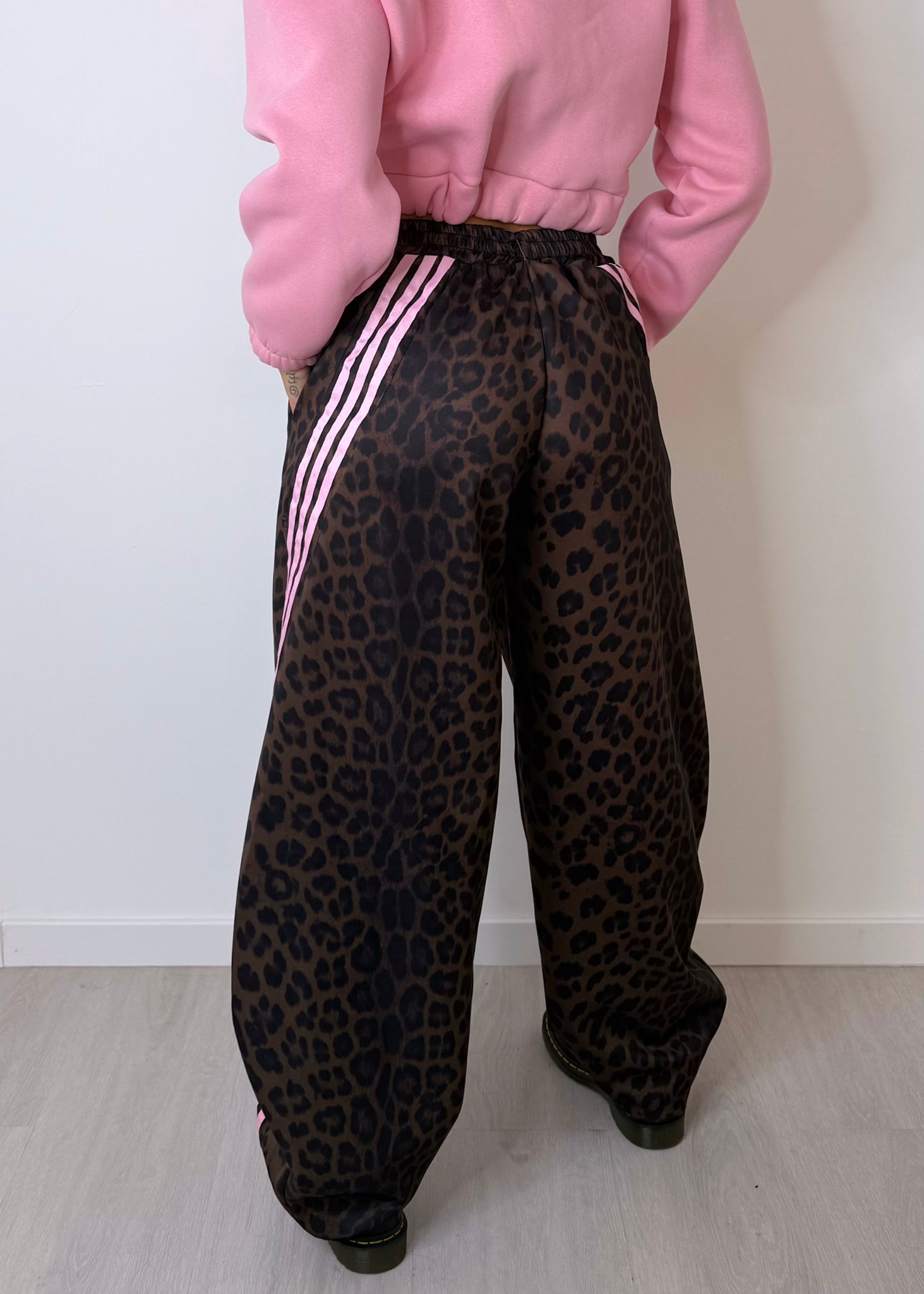Interamente leopardato, è reso ancora più particolare dalle tre righe laterali rosa che donano un tocco sportivo e glamour. Il fondo può essere indossato a palazzo per un effetto fluido oppure stretto con i ganci per un mood più street.