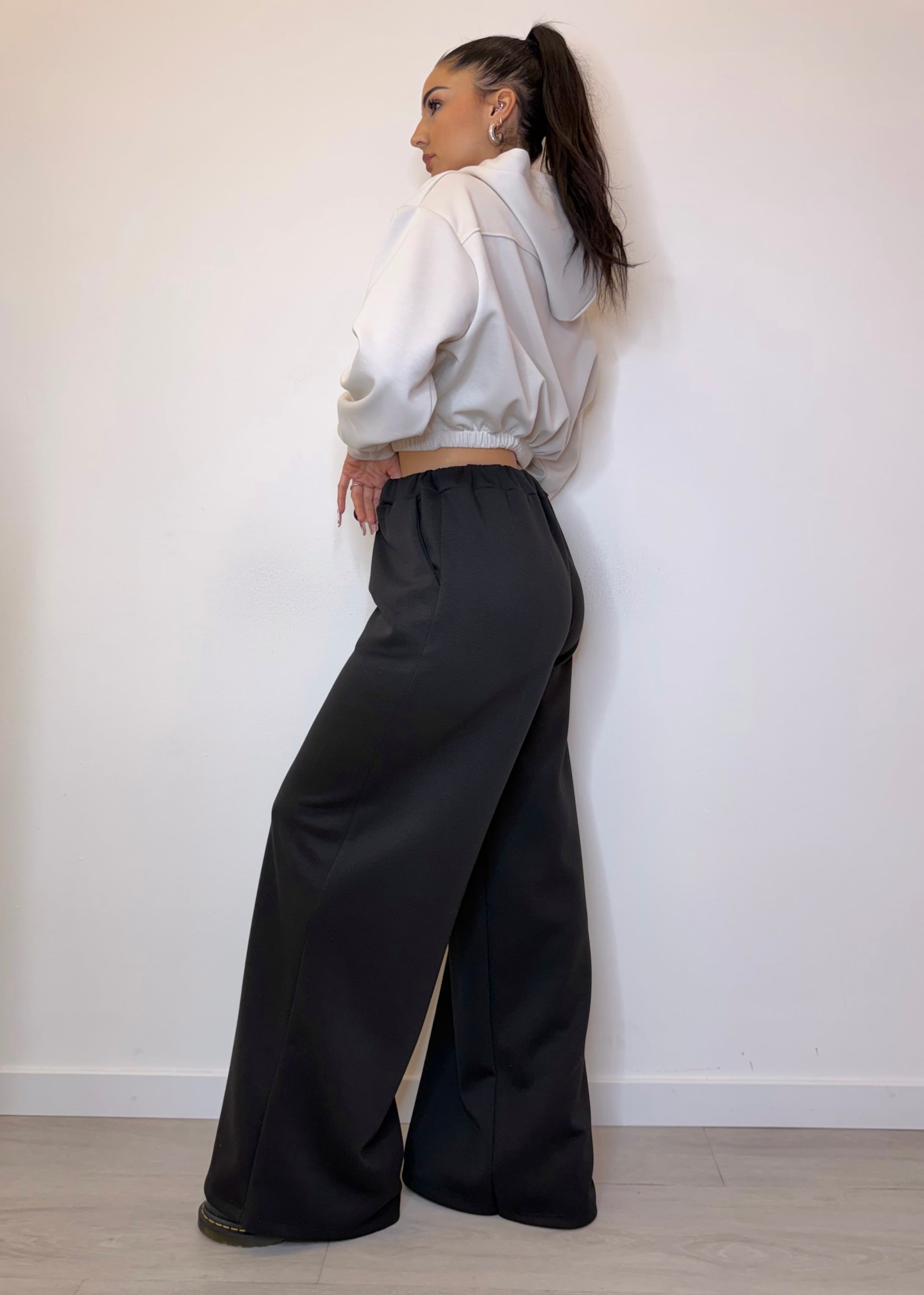 Pantalone tuta palazzo, dal design moderno e dalla vestibilità estremamente comoda. Realizzato in viscosa, un tessuto morbido, fluido e piacevole sulla pelle, che garantisce comfort e leggerezza durante tutta la giornata. Molto elasticizzato.