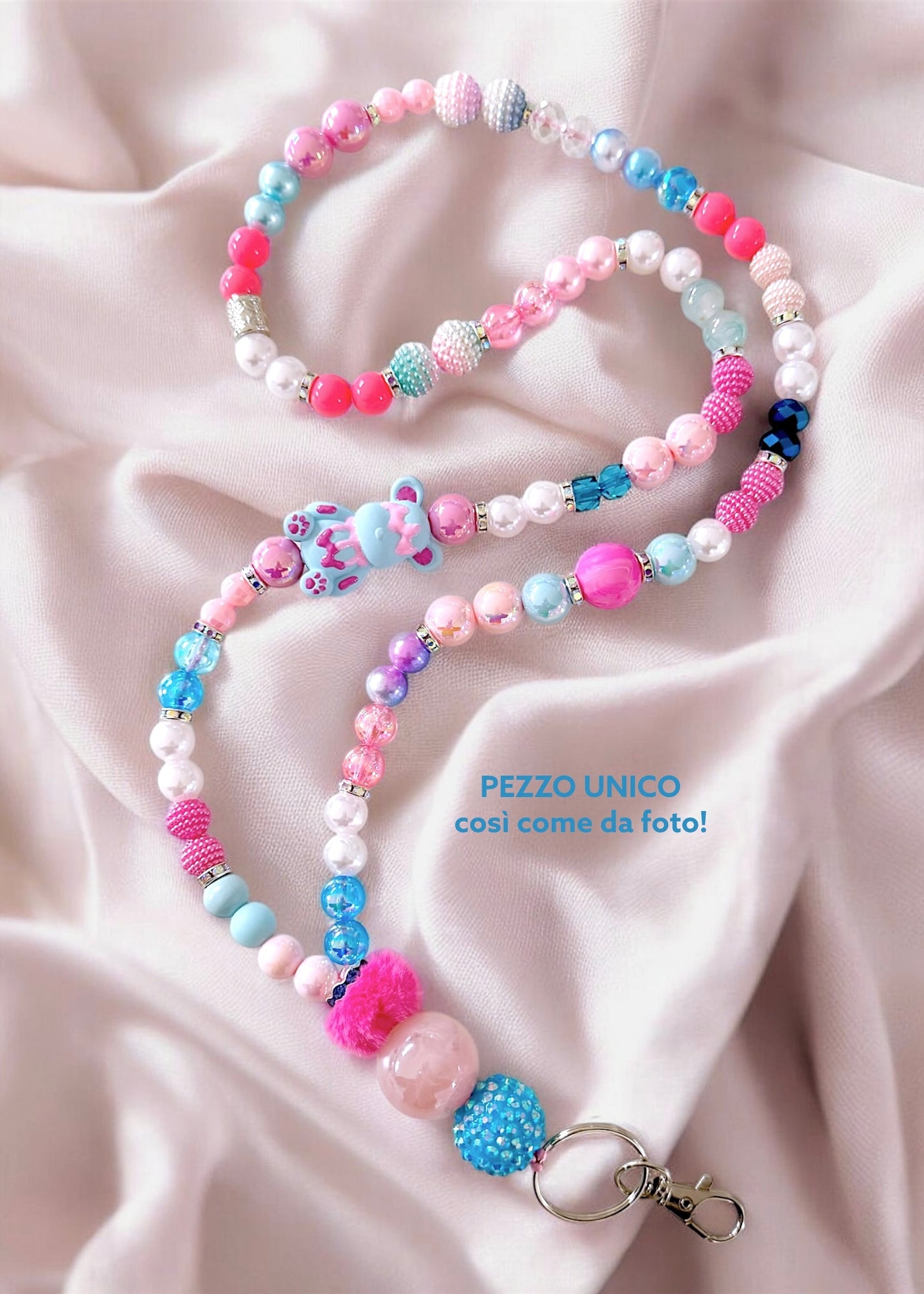 Questo è un pezzo unico, già pronto e disponibile, identico in ogni dettaglio all’immagine: forma, disposizione delle perle, colori e finiture. Ogni nostro portachiavi è fatto a mano, ma solo dove è specificato “PEZZO UNICO COME DA FOTO” riceverai proprio quell’articolo preciso che vedi.