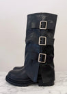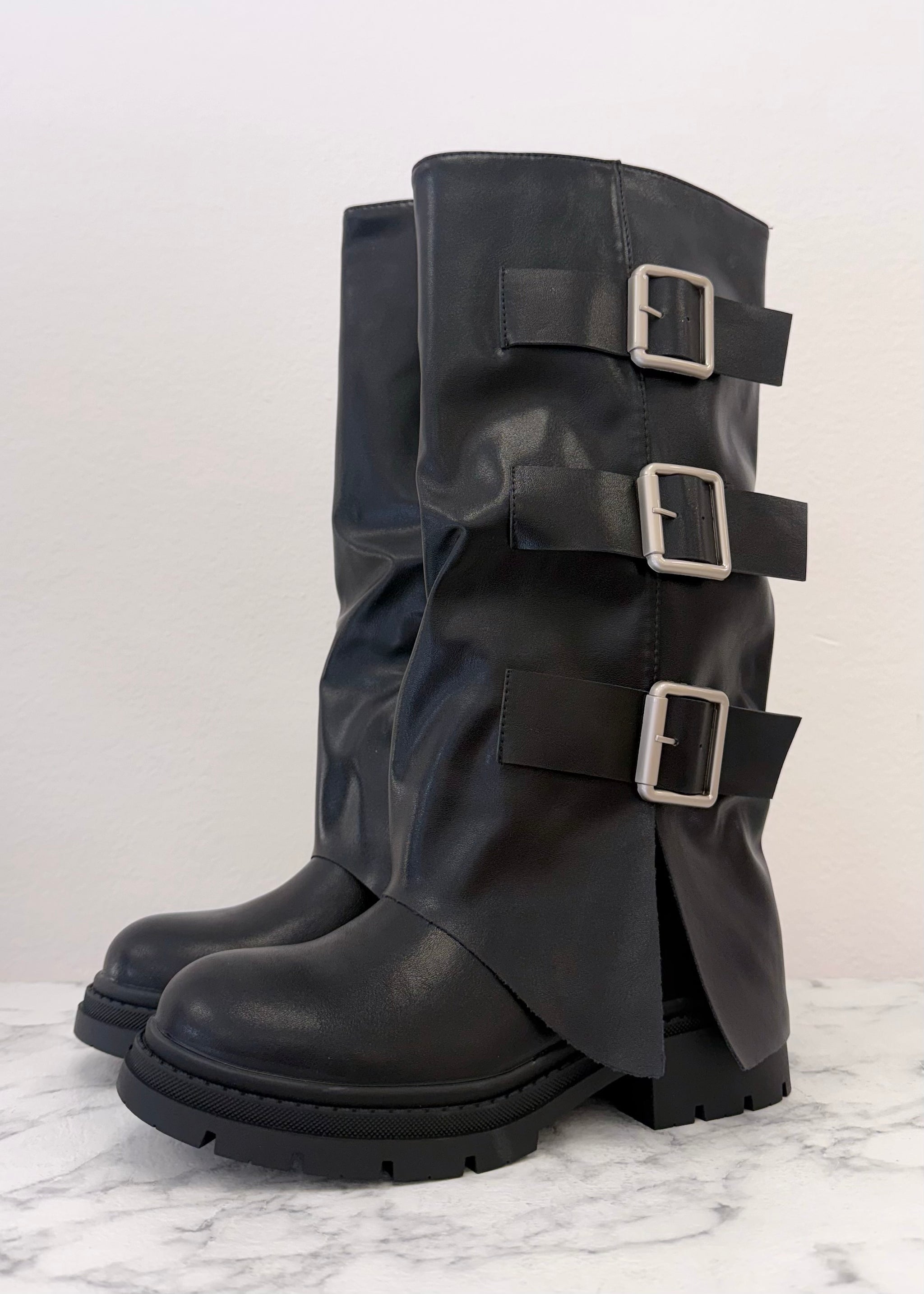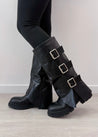 Elegante e grintoso, questo stivale al ginocchio è realizzato in morbida eco pelle dal finish opaco. Il design è valorizzato da tre fibbie decorative posizionate lateralmente, che donano carattere e uno stile deciso. La zip interna, discreta e funzionale, consente una calzata comoda e veloce. Perfetto da abbinare sia a look casual che a outfit più audaci, è un must-have per affrontare la stagione con stile.