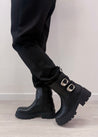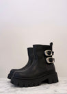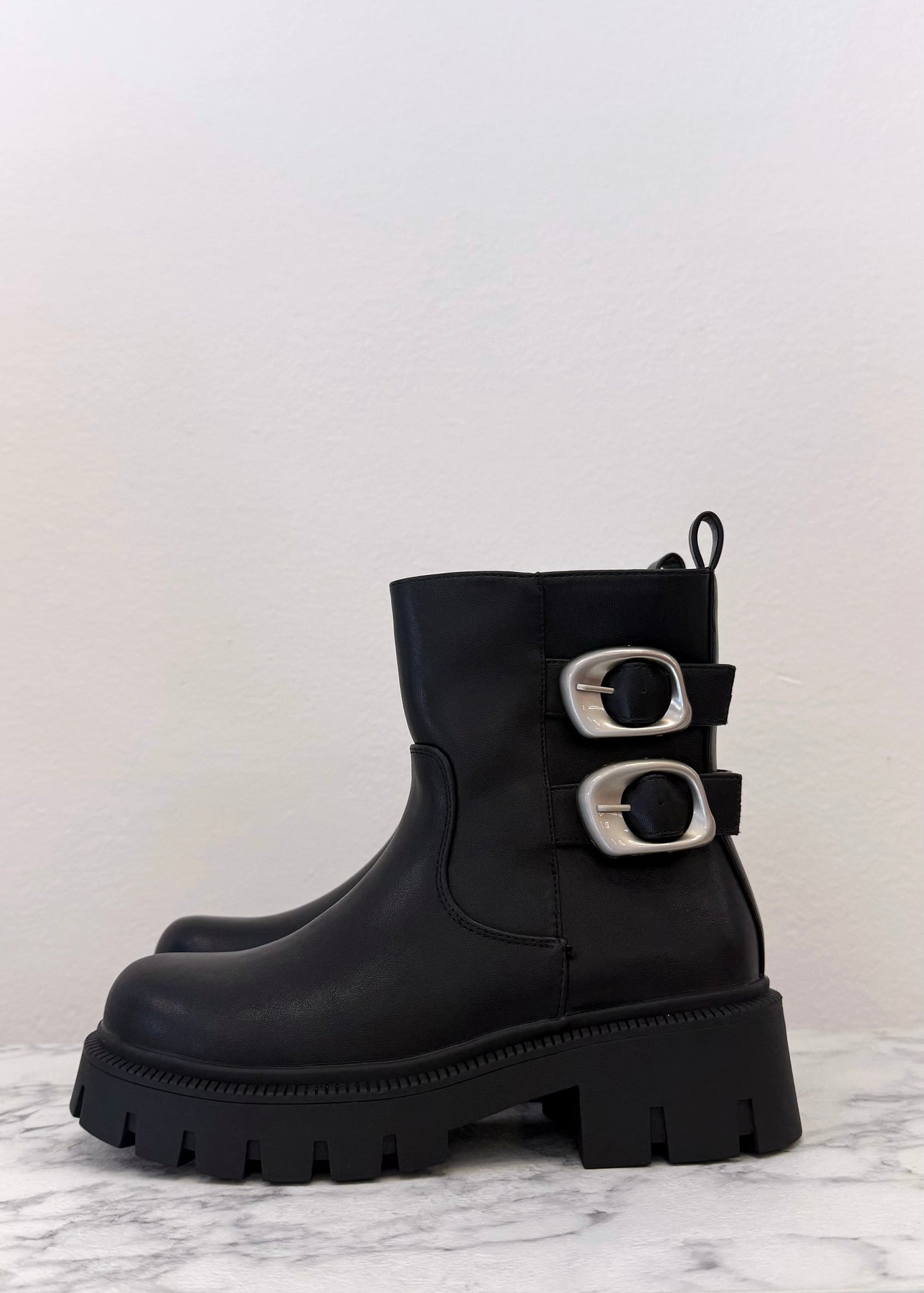 Dal design grintoso e contemporaneo, questo stivaletto basso in eco pelle unisce stile e praticità. Dotato di due fibbie laterali decorative che aggiungono un tocco rock, presenta una zip interna per una calzata facile e veloce. La suola leggermente rialzata garantisce comfort per tutto il giorno, rendendolo perfetto per affrontare la città con carattere e stile.