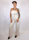 Tuta intera dal design elegante e raffinato, perfetta per cerimonie, eventi o serate. Il corpino presenta una chiusura asimmetrica decorata con bottoni dorati in rilievo, che donano un tocco di luce e originalità. La vita alta valorizza la figura, mentre il pantalone palazzo dona slancio e comfort.